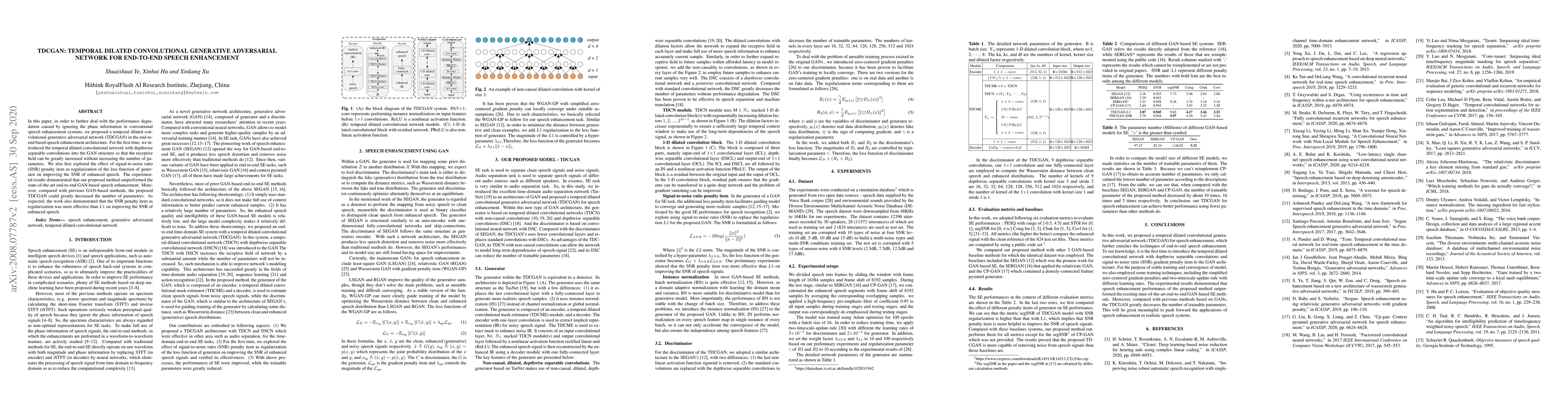 The paper proposes TDCGAN, a temporal dilated convolutional GAN for end-to-end speech enhancement, which incorporates depthwise separable convolutions to increase the receptive field without parameter inflation. The method also employs an SNR penalty in the loss function, outperforming state-of-the-art GAN-based methods in SNR improvement.