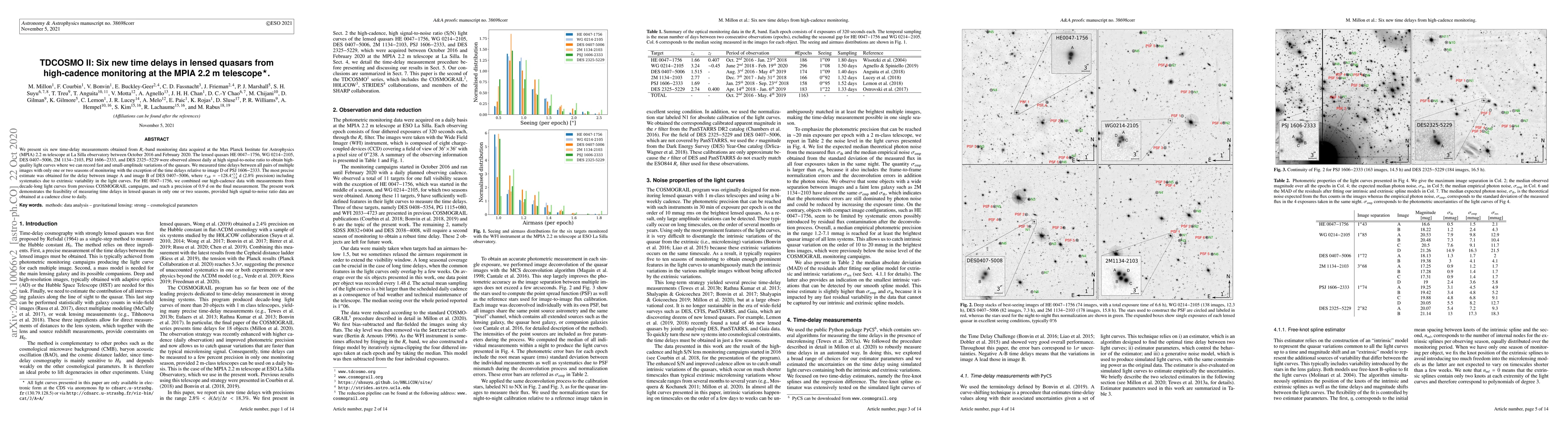 The research presents six new time-delay measurements in lensed quasars using high-cadence monitoring at the MPIA 2.2m telescope. The methodology involves almost daily observations at high signal-to-noise ratio to record fast and small-amplitude variations in quasar light curves, enabling precise time delay measurements with one or two seasons of monitoring.