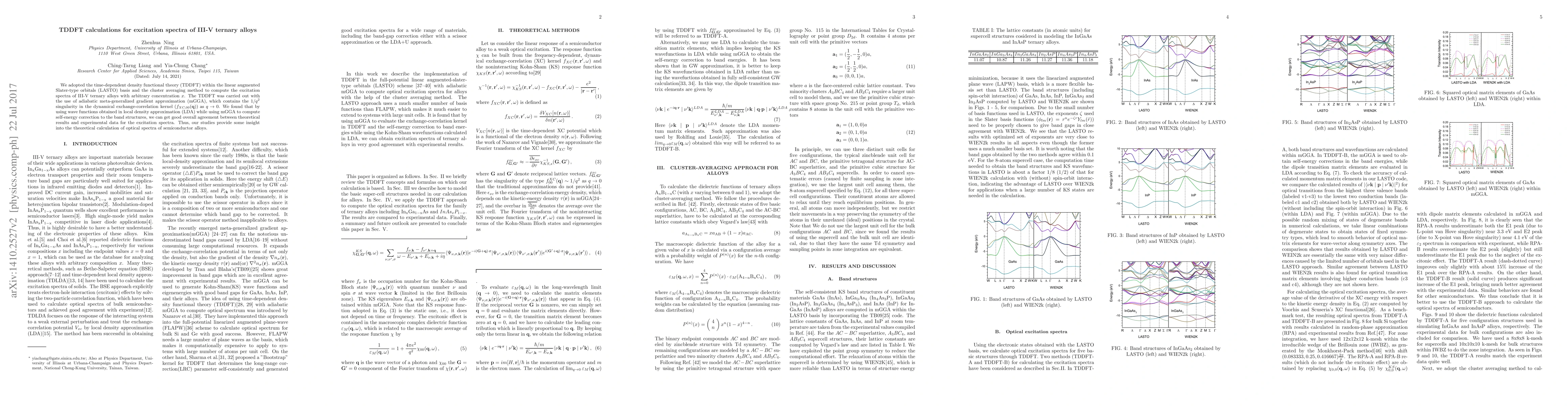 This paper uses TDDFT with mGGA to calculate the excitation spectra of III-V ternary alloys, achieving good agreement with experimental data by combining LDA wave functions with mGGA self-energy corrections. The study offers insights into the theoretical computation of optical spectra in semiconductor alloys.