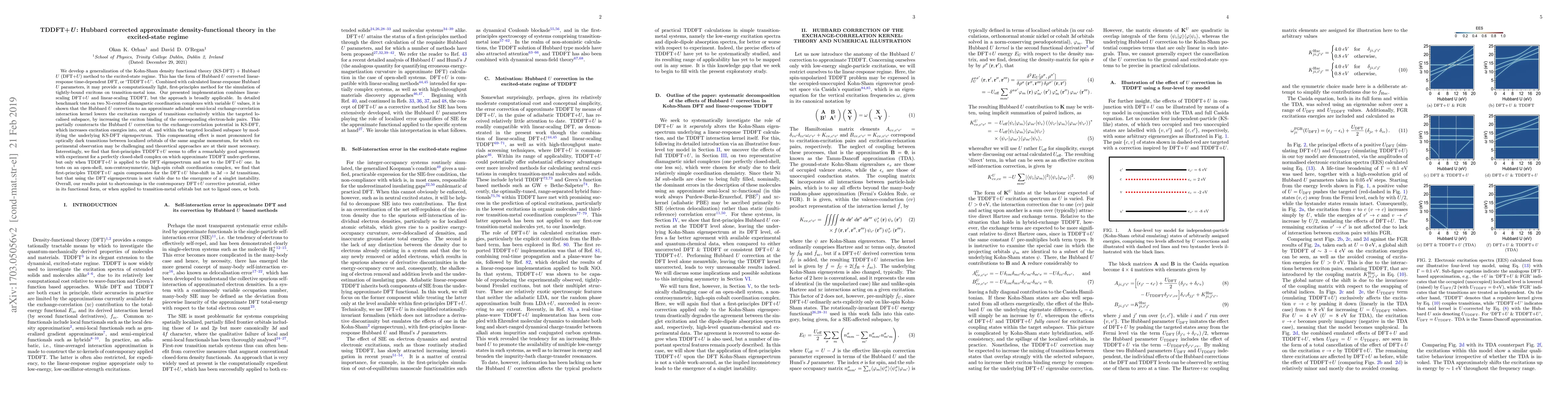 We develop a generalization of the Kohn-Sham density functional theory (KS-DFT) + Hubbard $U$ (DFT+$U$) method to the excited-state regime. This has the form of Hubbard $U$ corrected linear-response time-dependent DFT, or `TDDFT+$U$'. Combined with calculated linear-response Hubbard $U$ parameters, it may provide a computationally light, first-principles method for the simulation of tightly-bound excitons on transition-metal ions. Our presented implementation combines linear-scaling DFT+$U$ and linear-scaling TDDFT, but the approach is broadly applicable. In detailed benchmark tests on two Ni-centred diamagnetic coordination complexes with variable $U$ values, it is shown that the Hubbard $U$ correction to an approximate adiabatic semi-local exchange-correlation interaction kernel lowers the excitation energies of transitions exclusively within the targeted localized subspace, by increasing the exciton binding of the corresponding electron-hole pairs. This partially counteracts the Hubbard $U$ correction to the exchange-correlation potential in KS-DFT, which increases excitation energies into, out of, and within the targeted localised subspace by modifying the underlying KS-DFT eigenspectrum. This compensating effect is most pronounced for optically dark transitions between localized orbitals of the same angular momentum, for which experimental observation may be challenging and theoretical approaches are at their most necessary. Overall, our results point to shortcomings in the contemporary DFT+$U$ corrective potential, either in its functional form, or when applied to transition-metal orbitals but not to ligand ones, or both.