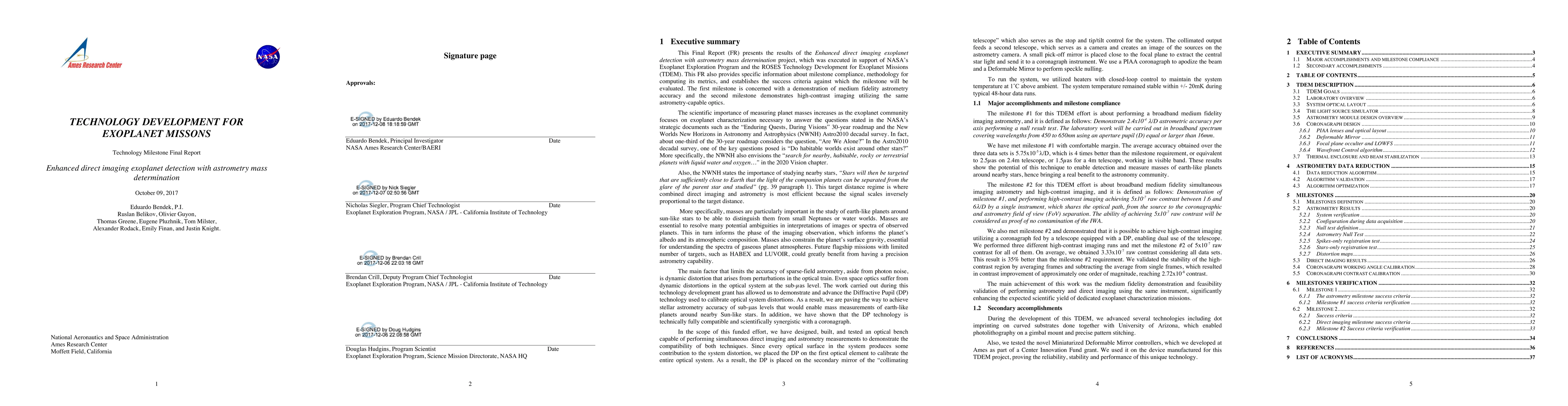 This report demonstrates significant advancements in astrometry and high-contrast imaging for exoplanet detection, achieving medium fidelity astrometry accuracy four times better than required and high-contrast imaging three times better than the milestone. These results validate the technique's potential for detecting and measuring Earth-like planets' masses.