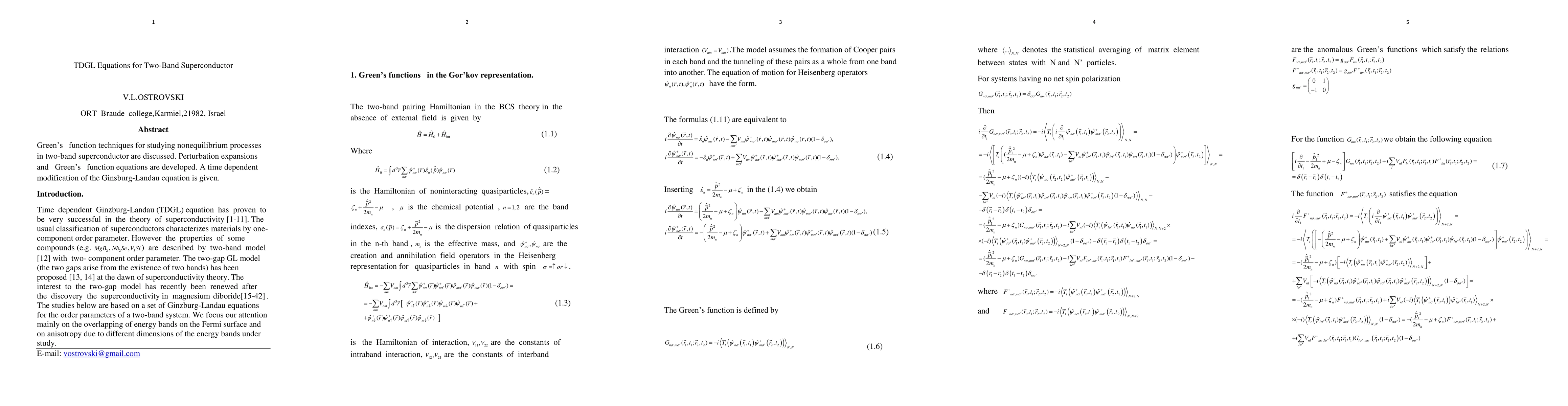 Green's function techniques for studying nonequilibrium processes in two-band superconductor are discussed. Perturbation expansions and Green's function equations are developed. A time dependent modification of the Ginsburg-Landau equation is given.