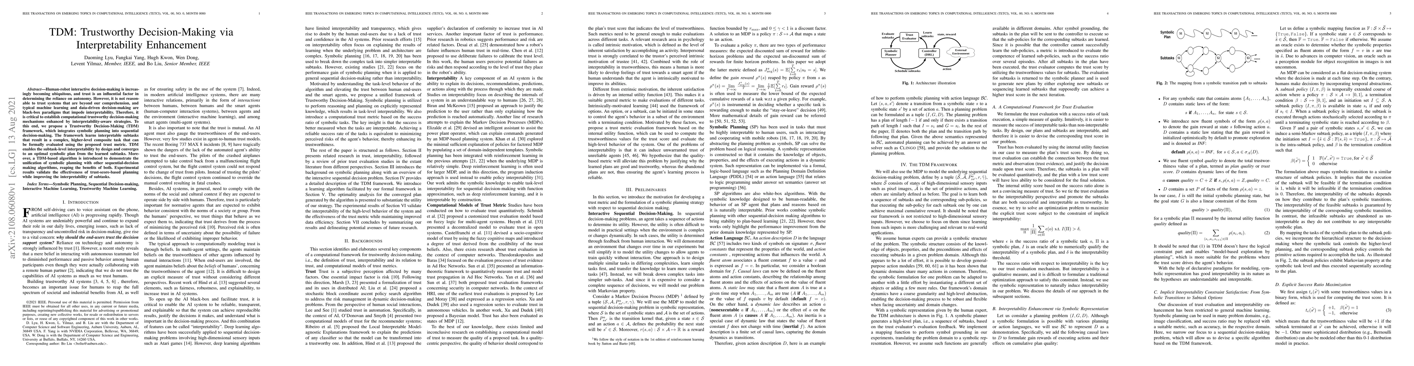This paper proposes a Trustworthy Decision-Making (TDM) framework that integrates symbolic planning to enhance interpretability in human-robot interactions. The TDM framework optimizes decision-making by learning and evaluating interpretable subtasks, thereby increasing trust in autonomous systems.