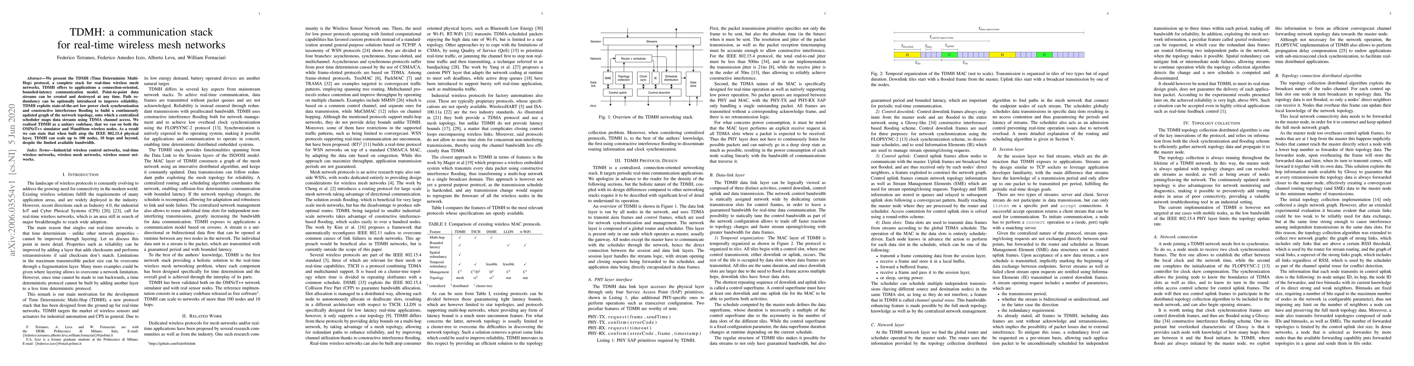 The TDMH protocol provides a complete communication stack for real-time wireless mesh networks, offering a connection-oriented, bounded-latency model with optional path redundancy for reliability. It utilizes advanced clock synchronization and constructive interference flooding to manage network topology and employs TDMA scheduling for efficient data stream management.
