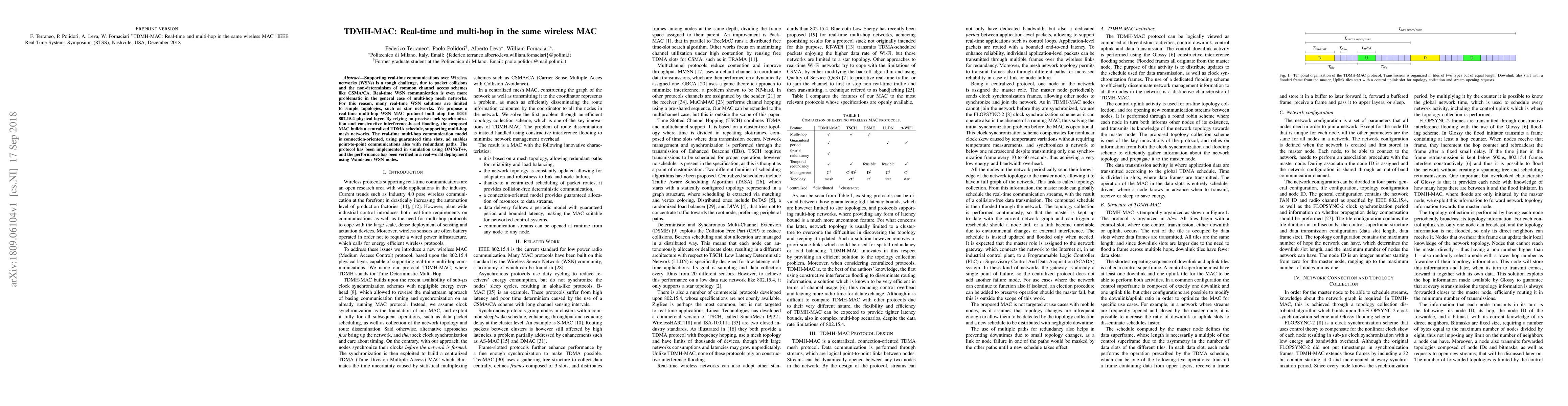 This paper proposes a real-time multi-hop MAC protocol for Wireless Sensor Networks (WSNs) that addresses packet collisions and non-determinism using precise clock synchronization and constructive interference-based flooding. The protocol supports multi-hop mesh networks with guaranteed time slots and redundant paths, validated through simulation and real-world deployment.