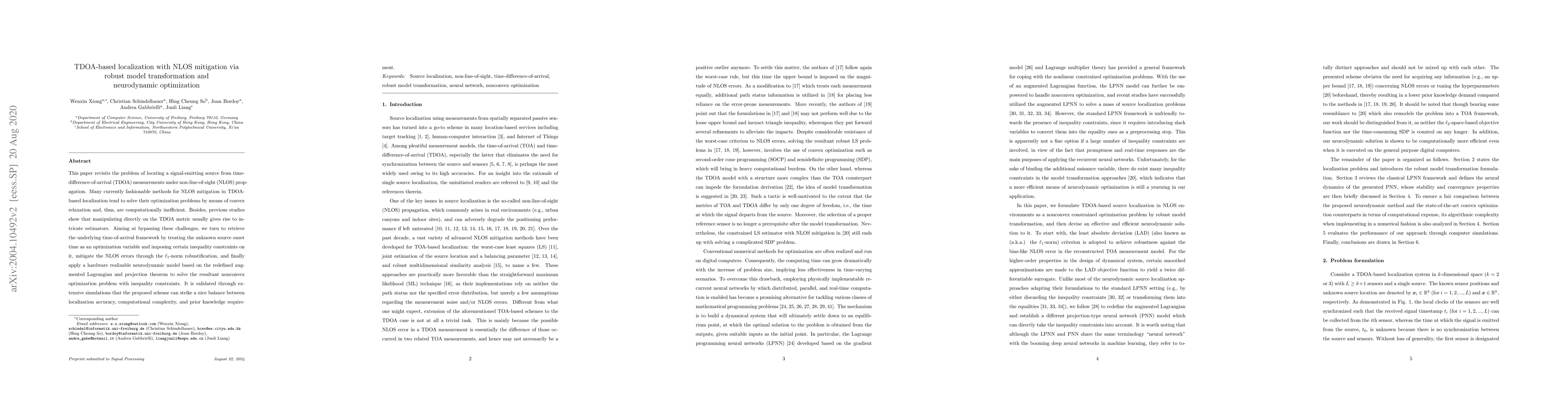 This paper proposes a TDOA-based localization method that mitigates non-line-of-sight (NLOS) errors using robust model transformation and neurodynamic optimization, achieving a balance between accuracy, complexity, and minimal prior knowledge. The approach redefines the time-of-arrival framework and employs $\ell_1$-norm robustification to handle NLOS issues effectively.