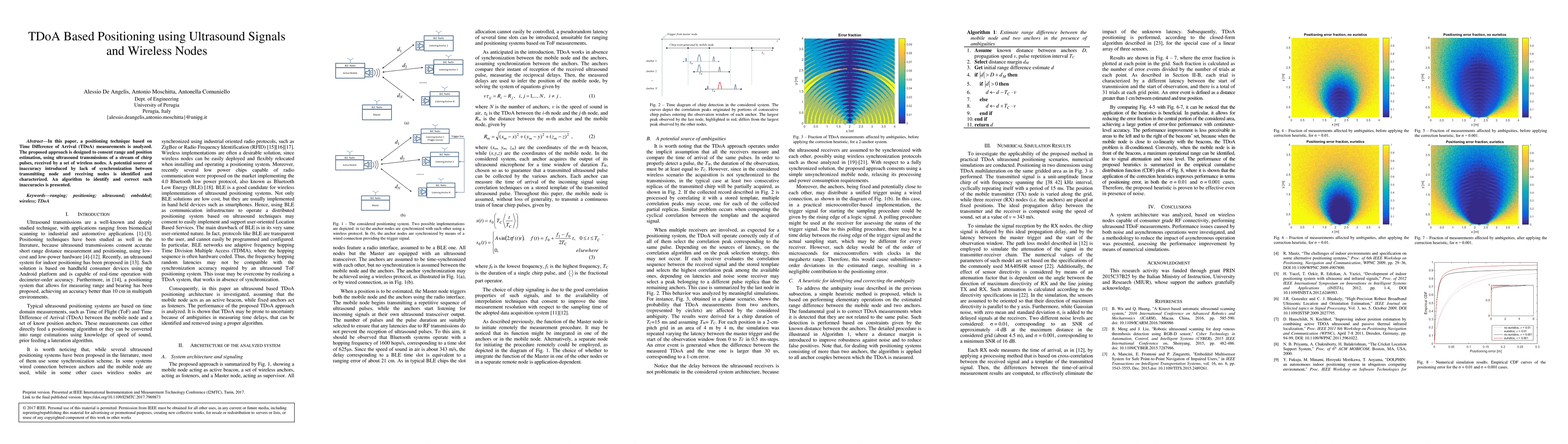 In this paper, a positioning technique based on Time Difference of Arrival (TDoA) measurements is analyzed. The proposed approach is designed to consent range and position estimation, using ultrasound transmissions of a stream of chirp pulses, received by a set of wireless nodes. A potential source of inaccuracy introduced by lack of synchronization between transmitting node and receiving nodes is identified and characterized. An algorithm to identify and correct such inaccuracies is presented.