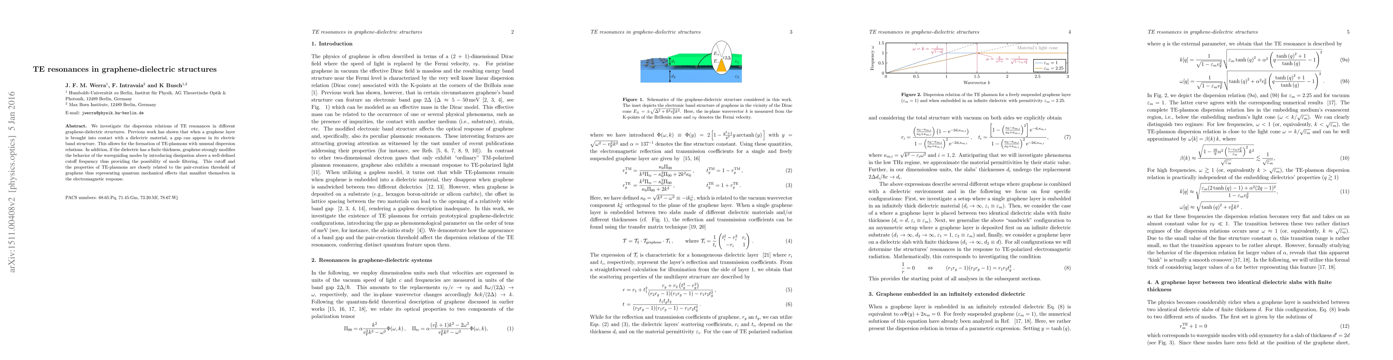 This paper explores the dispersion relations of transverse electric (TE) resonances in graphene-dielectric structures, revealing how graphene's interaction with dielectrics can create gaps in its band structure, leading to unique TE-plasmon behavior and mode filtering capabilities. The study highlights the quantum mechanical effects influencing these electromagnetic responses.