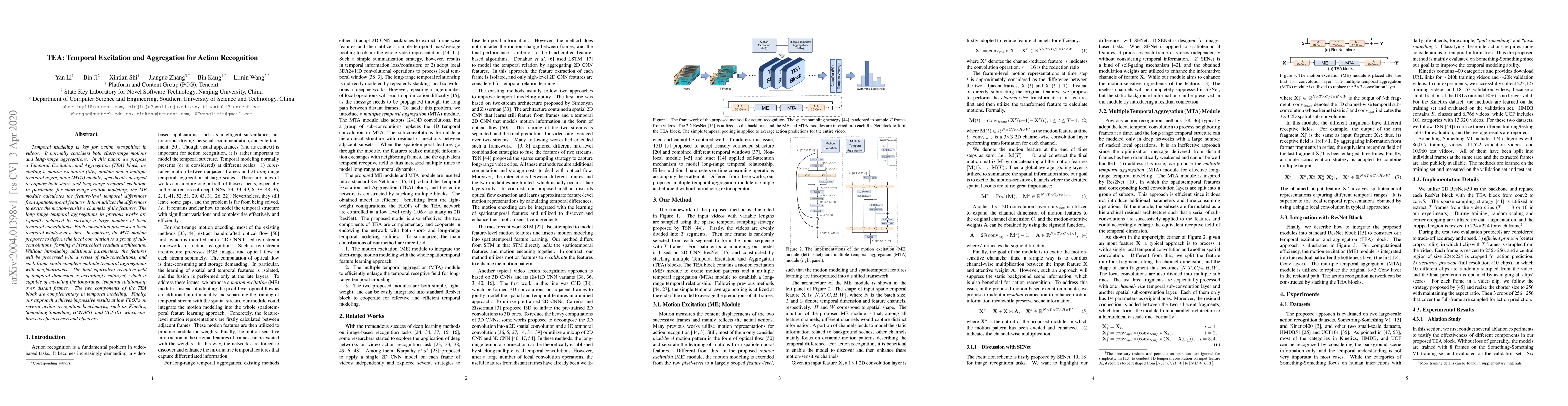 The paper proposes a Temporal Excitation and Aggregation (TEA) block for action recognition in videos, featuring a motion excitation module for short-range motion and a multiple temporal aggregation module for long-range temporal relationships. The TEA block achieves high recognition accuracy with low computational cost on several benchmarks.