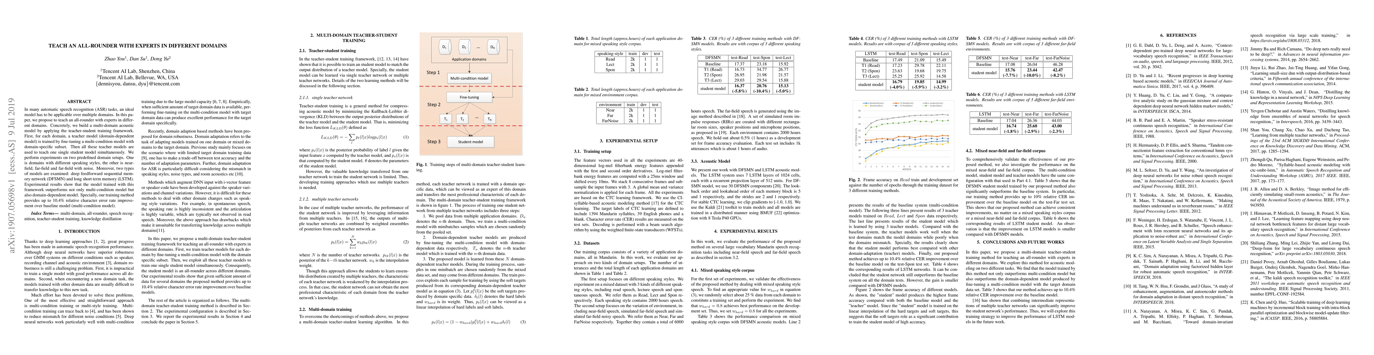 In many automatic speech recognition (ASR) tasks, an ideal model has to be applicable over multiple domains. In this paper, we propose to teach an all-rounder with experts in different domains. Concretely, we build a multi-domain acoustic model by applying the teacher-student training framework. First, for each domain, a teacher model (domain-dependent model) is trained by fine-tuning a multi-condition model with domain-specific subset. Then all these teacher models are used to teach one single student model simultaneously. We perform experiments on two predefined domain setups. One is domains with different speaking styles, the other is nearfield, far-field and far-field with noise. Moreover, two types of models are examined: deep feedforward sequential memory network (DFSMN) and long short term memory (LSTM). Experimental results show that the model trained with this framework outperforms not only multi-condition model but also domain-dependent model. Specially, our training method provides up to 10.4% relative character error rate improvement over baseline model (multi-condition model).