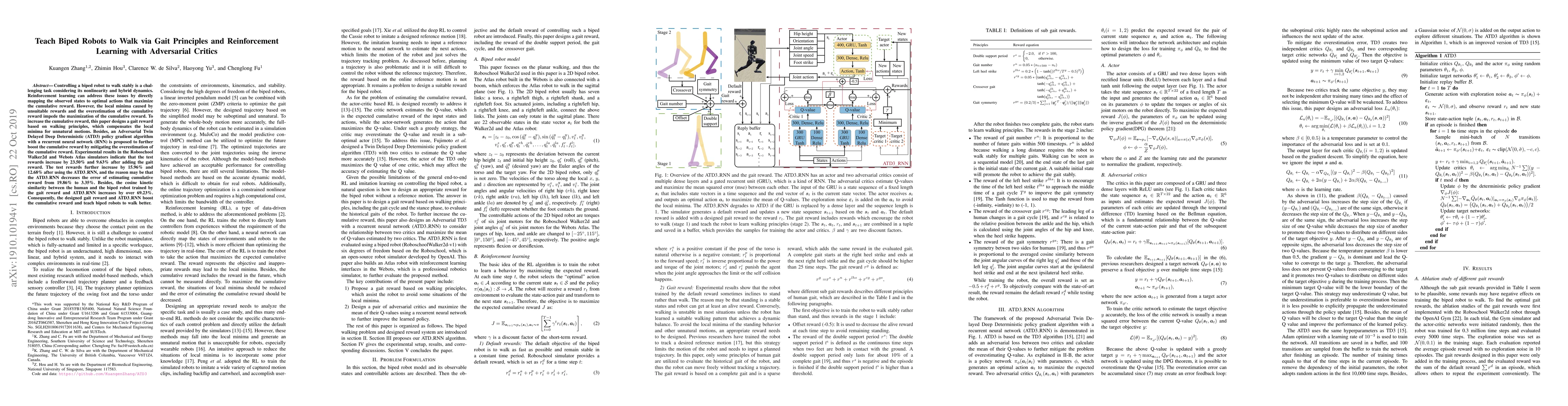 This paper proposes a gait reward based on walking principles and an Adversarial Twin Delayed Deep Deterministic policy gradient (ATD3) algorithm with a recurrent neural network (RNN) to enhance biped robot walking stability. Experimental results show significant improvements in cumulative rewards and kinetic similarity to human gait.
