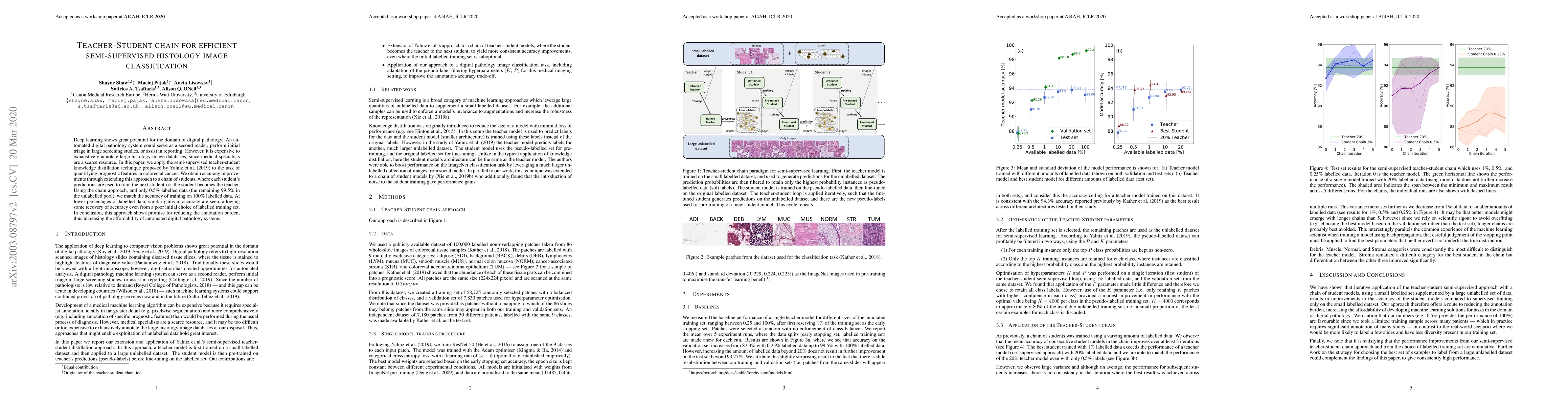 Deep learning shows great potential for the domain of digital pathology. An automated digital pathology system could serve as a second reader, perform initial triage in large screening studies, or assist in reporting. However, it is expensive to exhaustively annotate large histology image databases, since medical specialists are a scarce resource. In this paper, we apply the semi-supervised teacher-student knowledge distillation technique proposed by Yalniz et al. (2019) to the task of quantifying prognostic features in colorectal cancer. We obtain accuracy improvements through extending this approach to a chain of students, where each student's predictions are used to train the next student i.e. the student becomes the teacher. Using the chain approach, and only 0.5% labelled data (the remaining 99.5% in the unlabelled pool), we match the accuracy of training on 100% labelled data. At lower percentages of labelled data, similar gains in accuracy are seen, allowing some recovery of accuracy even from a poor initial choice of labelled training set. In conclusion, this approach shows promise for reducing the annotation burden, thus increasing the affordability of automated digital pathology systems.