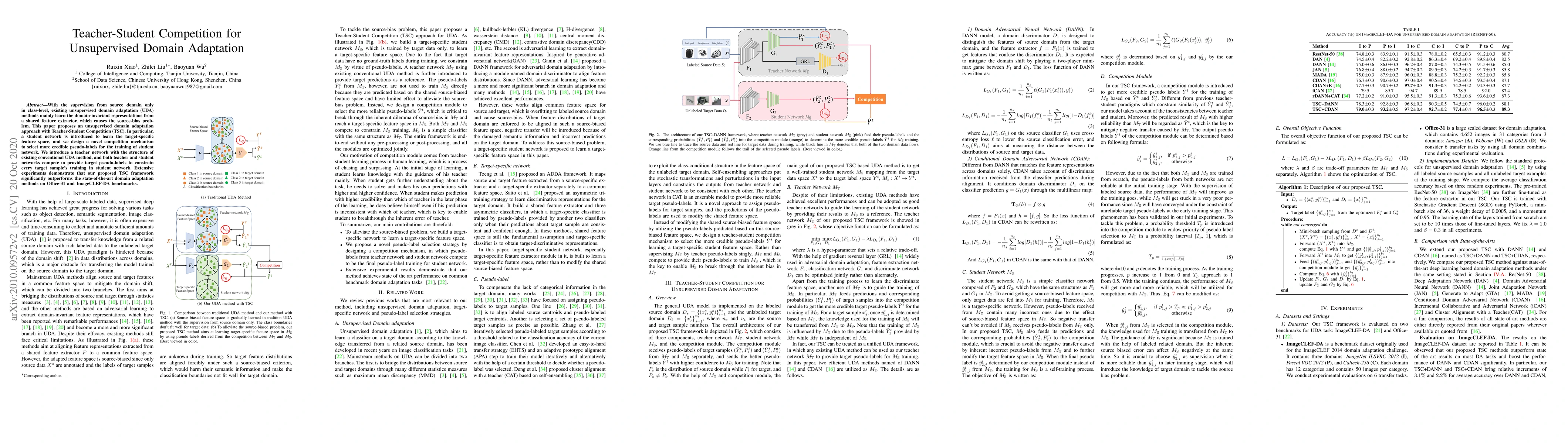This paper introduces a Teacher-Student Competition (TSC) framework for unsupervised domain adaptation, addressing the source-bias issue by having a student network learn target-specific features and a teacher network with conventional UDA methods. The competition mechanism selects credible pseudo-labels, leading to superior performance on Office-31 and ImageCLEF-DA benchmarks.