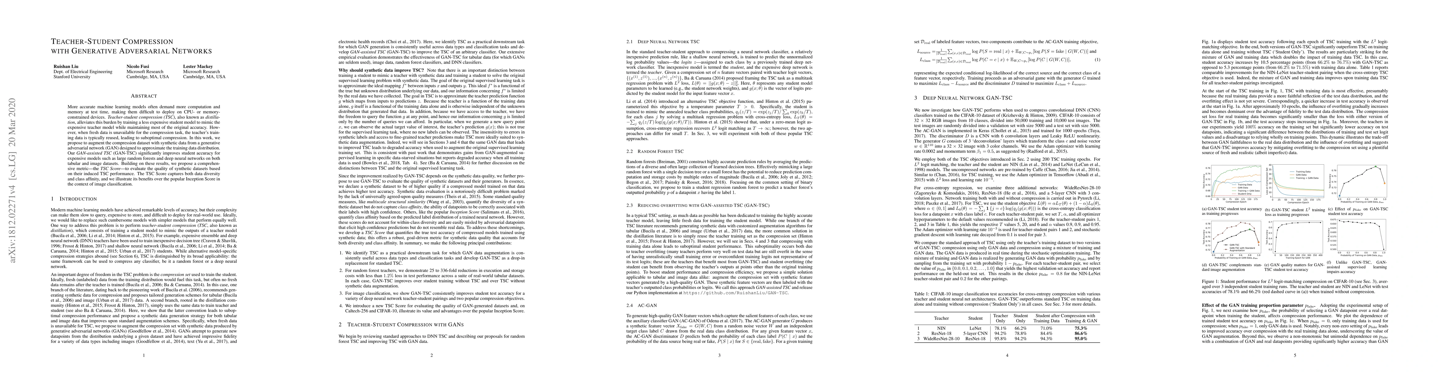 More accurate machine learning models often demand more computation and memory at test time, making them difficult to deploy on CPU- or memory-constrained devices. Teacher-student compression (TSC), also known as distillation, alleviates this burden by training a less expensive student model to mimic the expensive teacher model while maintaining most of the original accuracy. However, when fresh data is unavailable for the compression task, the teacher's training data is typically reused, leading to suboptimal compression. In this work, we propose to augment the compression dataset with synthetic data from a generative adversarial network (GAN) designed to approximate the training data distribution. Our GAN-assisted TSC (GAN-TSC) significantly improves student accuracy for expensive models such as large random forests and deep neural networks on both tabular and image datasets. Building on these results, we propose a comprehensive metric---the TSC Score---to evaluate the quality of synthetic datasets based on their induced TSC performance. The TSC Score captures both data diversity and class affinity, and we illustrate its benefits over the popular Inception Score in the context of image classification.
