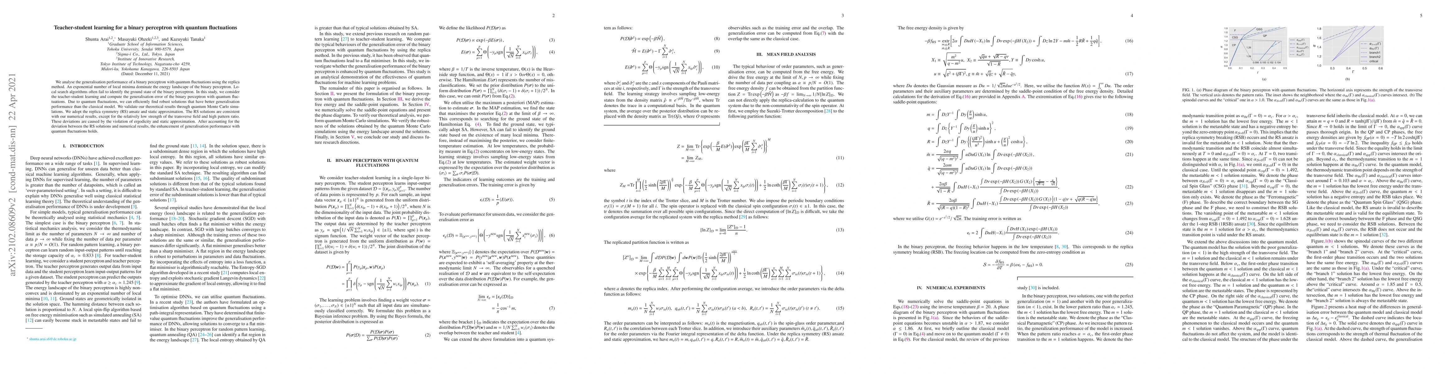 This paper investigates the generalisation performance of a binary perceptron with quantum fluctuations using the teacher-student learning method, finding that quantum effects lead to better generalisation compared to classical models. Theoretical results from the replica method and quantum Monte Carlo simulations show enhanced performance, though deviations occur due to ergodicity violations and static approximations.
