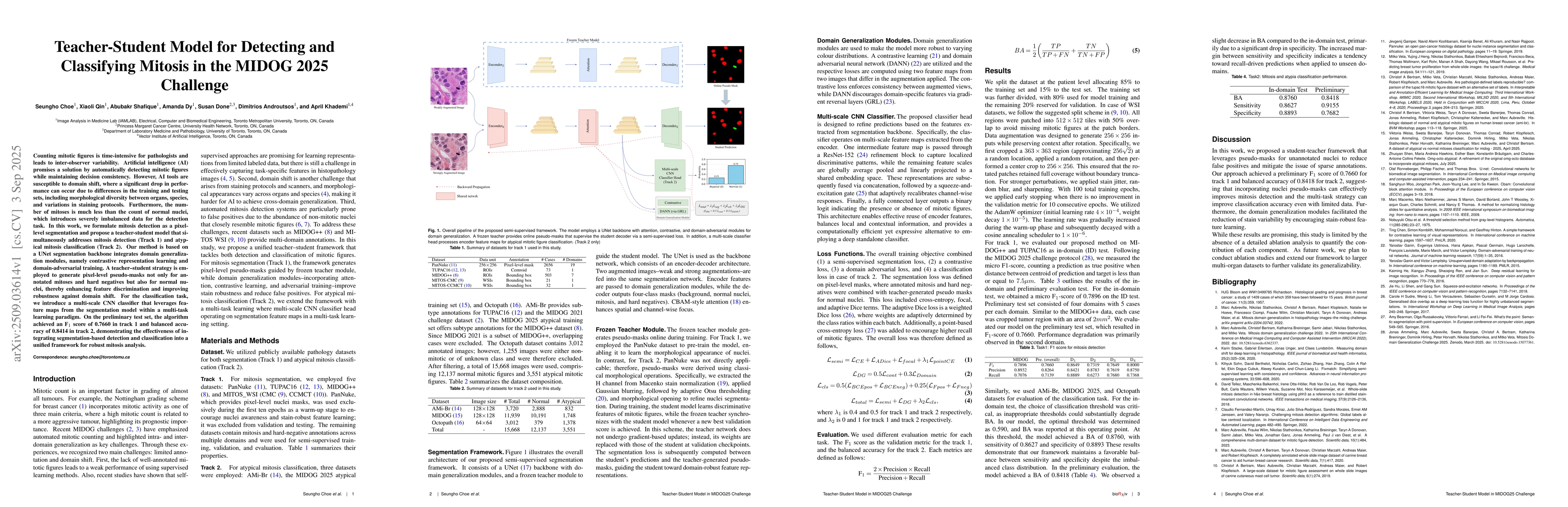 Counting mitotic figures is time-intensive for pathologists and leads to inter-observer variability. Artificial intelligence (AI) promises a solution by automatically detecting mitotic figures while maintaining decision consistency. However, AI tools are susceptible to domain shift, where a significant drop in performance can occur due to differences in the training and testing sets, including morphological diversity between organs, species, and variations in staining protocols. Furthermore, the number of mitoses is much less than the count of normal nuclei, which introduces severely imbalanced data for the detection task. In this work, we formulate mitosis detection as a pixel-level segmentation and propose a teacher-student model that simultaneously addresses mitosis detection (Track 1) and atypical mitosis classification (Track 2). Our method is based on a UNet segmentation backbone that integrates domain generalization modules, namely contrastive representation learning and domain-adversarial training. A teacher-student strategy is employed to generate pixel-level pseudo-masks not only for annotated mitoses and hard negatives but also for normal nuclei, thereby enhancing feature discrimination and improving robustness against domain shift. For the classification task, we introduce a multi-scale CNN classifier that leverages feature maps from the segmentation model within a multi-task learning paradigm. On the preliminary test set, the algorithm achieved an F1 score of 0.7660 in Track 1 and balanced accuracy of 0.8414 in Track 2, demonstrating the effectiveness of integrating segmentation-based detection and classification into a unified framework for robust mitosis analysis.