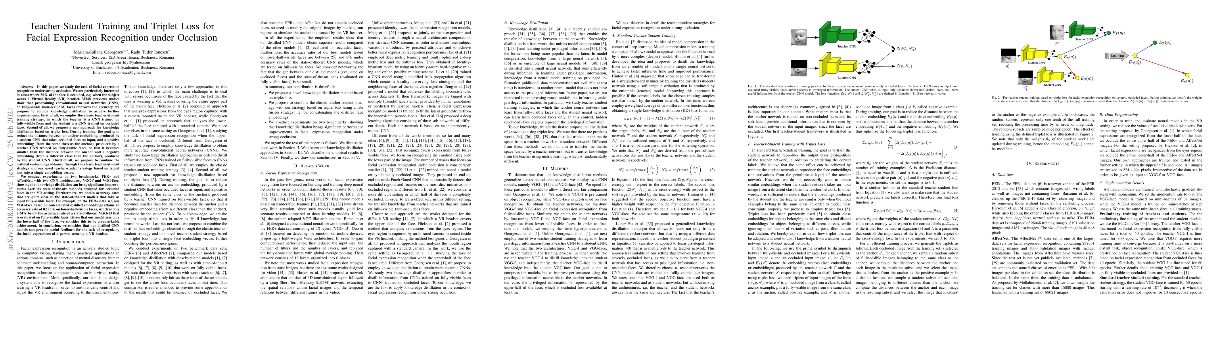 This paper proposes an enhanced facial expression recognition method under strong occlusion using teacher-student training and a novel triplet loss-based knowledge distillation approach. Experiments show significant improvements over state-of-the-art methods on FER+ and AffectNet datasets.