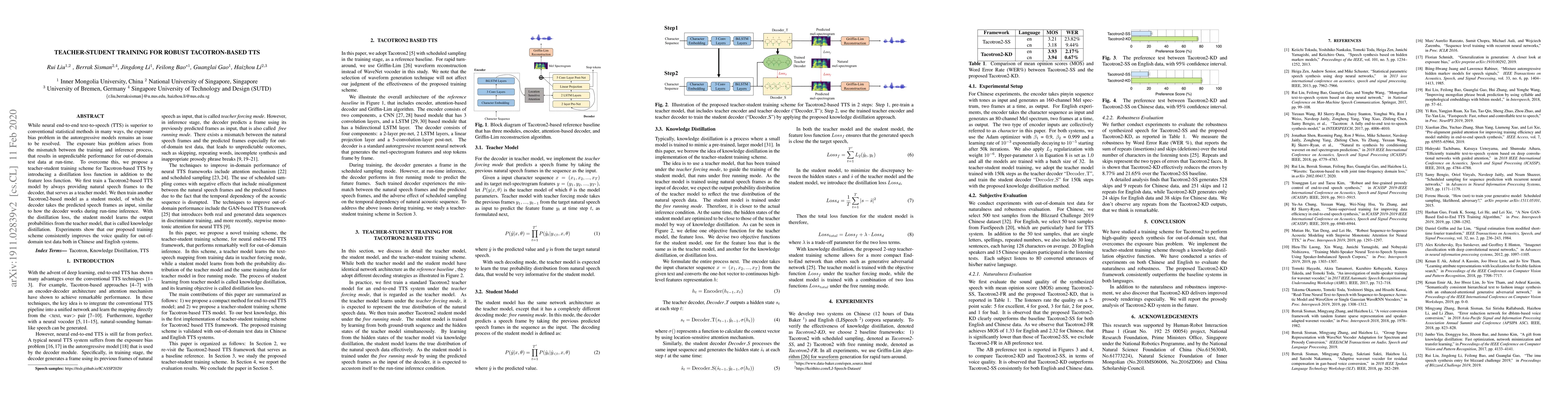 This paper proposes a teacher-student training scheme for Tacotron-based TTS to address the exposure bias problem, introducing a distillation loss to improve model performance on out-of-domain test data. The method trains a teacher model with natural speech frames and a student model using predicted frames, achieving better voice quality in both Chinese and English systems.