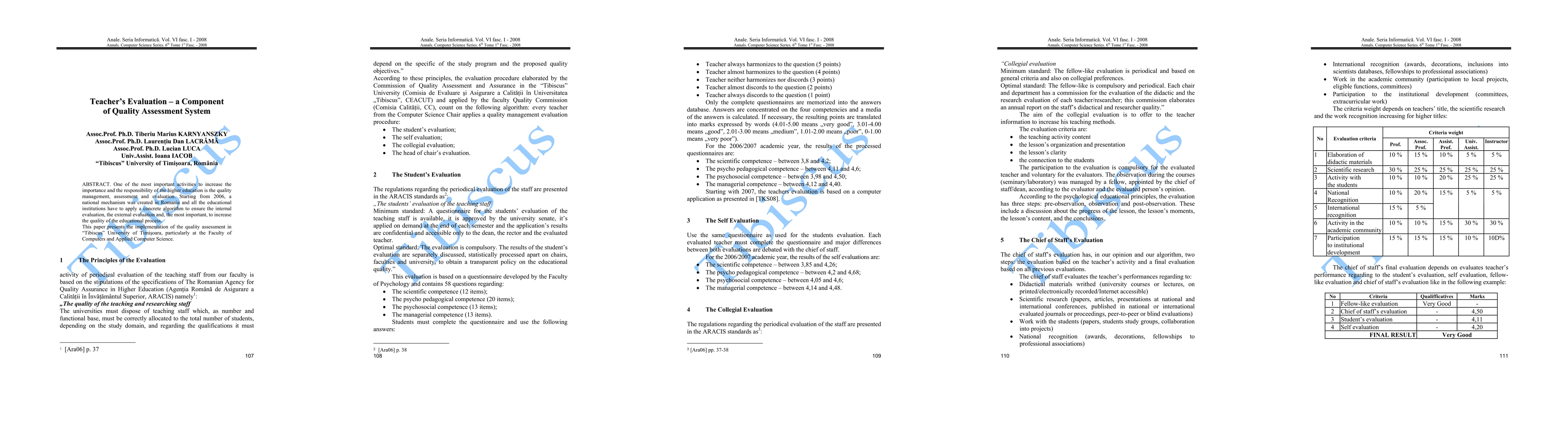 This paper evaluates the quality assessment system in Romanian universities, focusing on Tibiscus University of Timisoara's implementation. It highlights the importance of teacher evaluation as a key component of quality management and assessment.