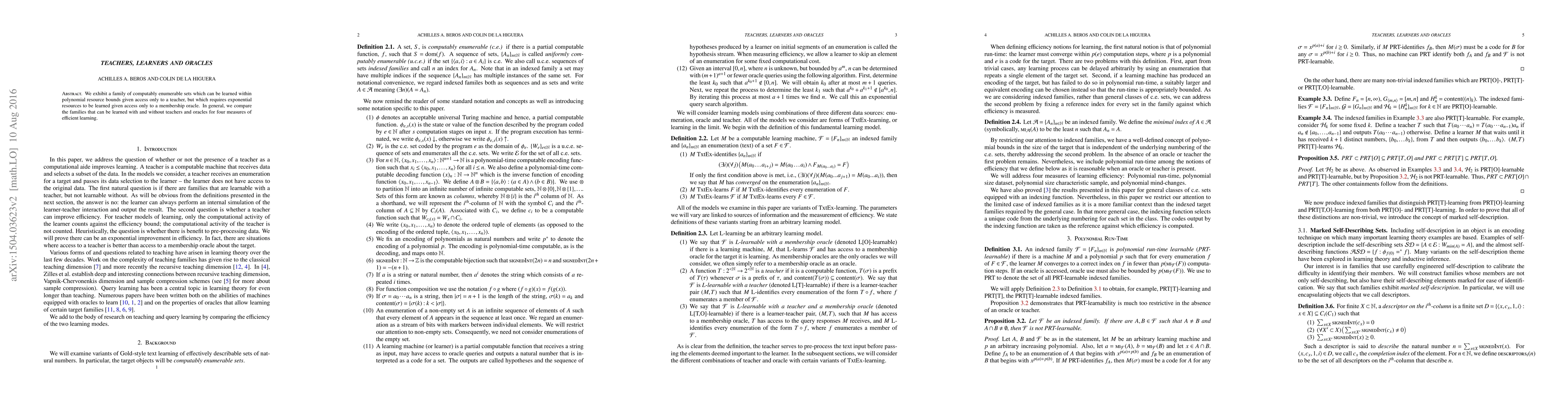 We exhibit a family of computably enumerable sets which can be learned within polynomial resource bounds given access only to a teacher, but which requires exponential resources to be learned given access only to a membership oracle. In general, we compare the families that can be learned with and without teachers and oracles for four measures of efficient learning.
