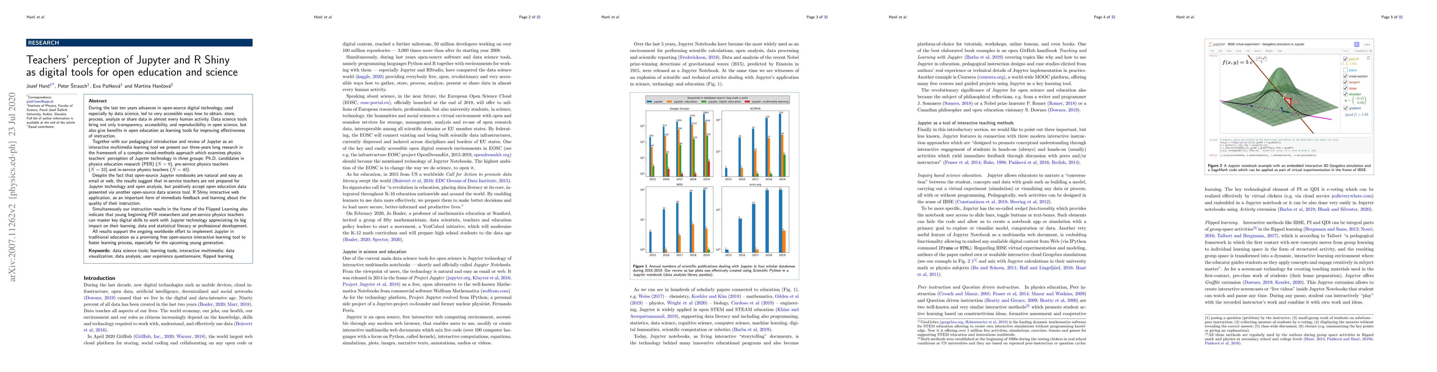 During the last ten years advances in open-source digital technology, used especially by data science, led to very accessible ways how to obtain, store, process, analyze or share data in almost every human activity. Data science tools bring not only transparency, accessibility, and reproducibility in open science, but also give benefits in open education as learning tools for improving effectiveness of instruction. Together with our pedagogical introduction and review of Jupyter as an interactive multimedia learning tool, we present our three-years long research in the framework of a complex mixed-methods approach which examines physics teachers' perception of Jupyter technology in three groups: Ph.D. candidates in physics education research (PER) ($N = 9$), pre-service physics teachers ($N = 33$) and in-service physics teachers ($N = 40$). Despite the fact that open-source Jupyter notebooks are natural and easy as email or web, the results suggest that in-service teachers are not prepared for Jupyter technology and open analysis, but positively accept open education data presented via another open-source data science tool, R Shiny interactive web application, as an important form of immediate feedback and learning about the quality of their instruction. Simultaneously our instruction results in the frame of the Flipped Learning also indicate that young beginning PER researchers and pre-service physics teachers can master key digital skills to work with Jupyter technology appreciating its big impact on their learning, data and statistical literacy or professional development. All results support the ongoing worldwide effort to implement Jupyter in traditional education as a promising free open-source interactive learning tool to foster learning process, especially for the upcoming young generation.