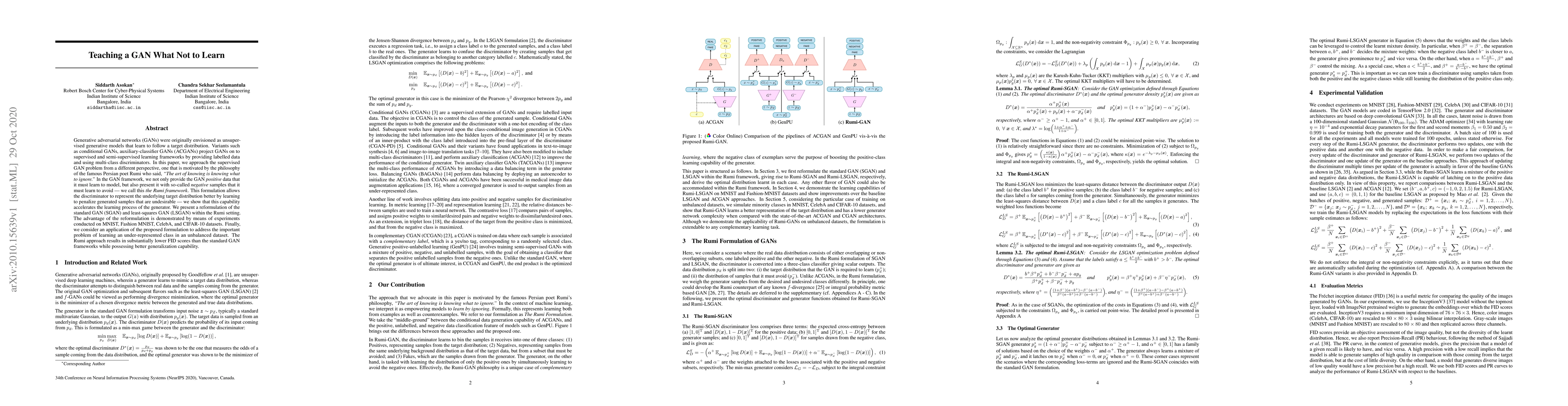 Generative adversarial networks (GANs) were originally envisioned as unsupervised generative models that learn to follow a target distribution. Variants such as conditional GANs, auxiliary-classifier GANs (ACGANs) project GANs on to supervised and semi-supervised learning frameworks by providing labelled data and using multi-class discriminators. In this paper, we approach the supervised GAN problem from a different perspective, one that is motivated by the philosophy of the famous Persian poet Rumi who said, "The art of knowing is knowing what to ignore." In the GAN framework, we not only provide the GAN positive data that it must learn to model, but also present it with so-called negative samples that it must learn to avoid - we call this "The Rumi Framework." This formulation allows the discriminator to represent the underlying target distribution better by learning to penalize generated samples that are undesirable - we show that this capability accelerates the learning process of the generator. We present a reformulation of the standard GAN (SGAN) and least-squares GAN (LSGAN) within the Rumi setting. The advantage of the reformulation is demonstrated by means of experiments conducted on MNIST, Fashion MNIST, CelebA, and CIFAR-10 datasets. Finally, we consider an application of the proposed formulation to address the important problem of learning an under-represented class in an unbalanced dataset. The Rumi approach results in substantially lower FID scores than the standard GAN frameworks while possessing better generalization capability.