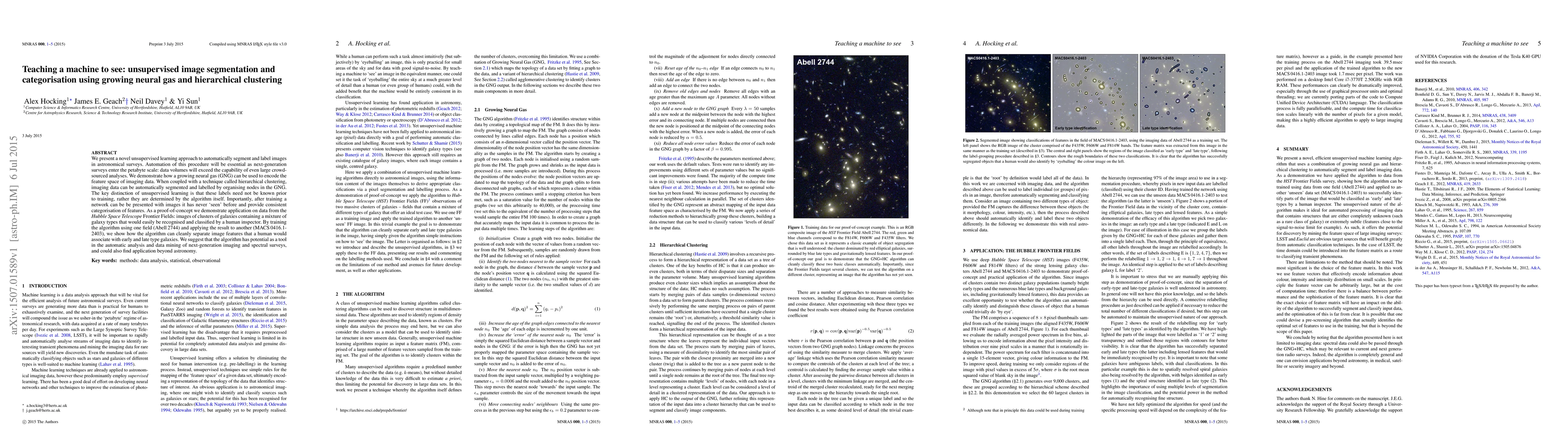 We present a novel unsupervised learning approach to automatically segment and label images in astronomical surveys. Automation of this procedure will be essential as next-generation surveys enter the petabyte scale: data volumes will exceed the capability of even large crowd-sourced analyses. We demonstrate how a growing neural gas (GNG) can be used to encode the feature space of imaging data. When coupled with a technique called hierarchical clustering, imaging data can be automatically segmented and labelled by organising nodes in the GNG. The key distinction of unsupervised learning is that these labels need not be known prior to training, rather they are determined by the algorithm itself. Importantly, after training a network can be be presented with images it has never 'seen' before and provide consistent categorisation of features. As a proof-of-concept we demonstrate application on data from the Hubble Space Telescope Frontier Fields: images of clusters of galaxies containing a mixture of galaxy types that would easily be recognised and classified by a human inspector. By training the algorithm using one field (Abell 2744) and applying the result to another (MACS0416.1-2403), we show how the algorithm can cleanly separate image features that a human would associate with early and late type galaxies. We suggest that the algorithm has potential as a tool in the automatic analysis and data mining of next-generation imaging and spectral surveys, and could also find application beyond astronomy.