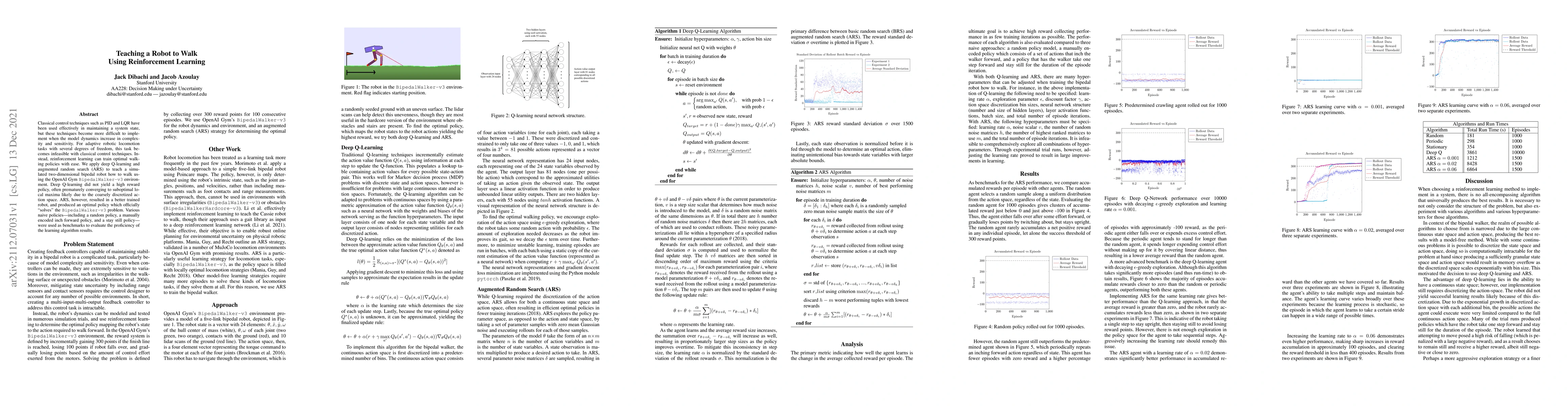 This paper explores using reinforcement learning to teach a bipedal robot to walk, finding that while deep Q-learning struggles with suboptimal convergence, augmented random search (ARS) successfully trains an optimal walking policy in the BipedalWalker-v3 environment. ARS effectively "solves" the problem, outperforming naive policies.