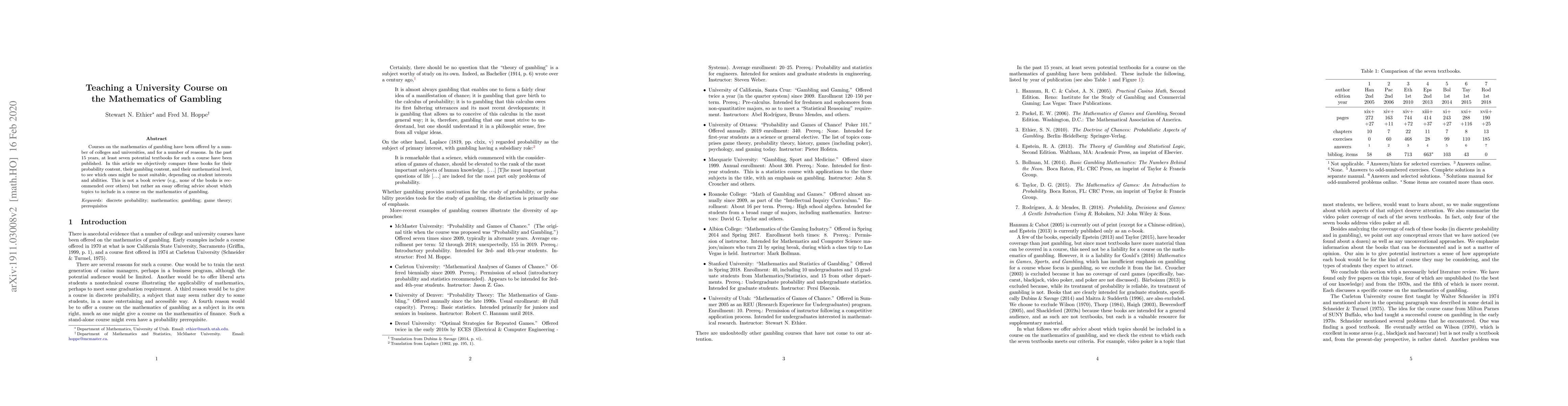 This study compares seven textbooks on the mathematics of gambling to recommend suitable topics for a university course, focusing on probability content, gambling content, and mathematical level.