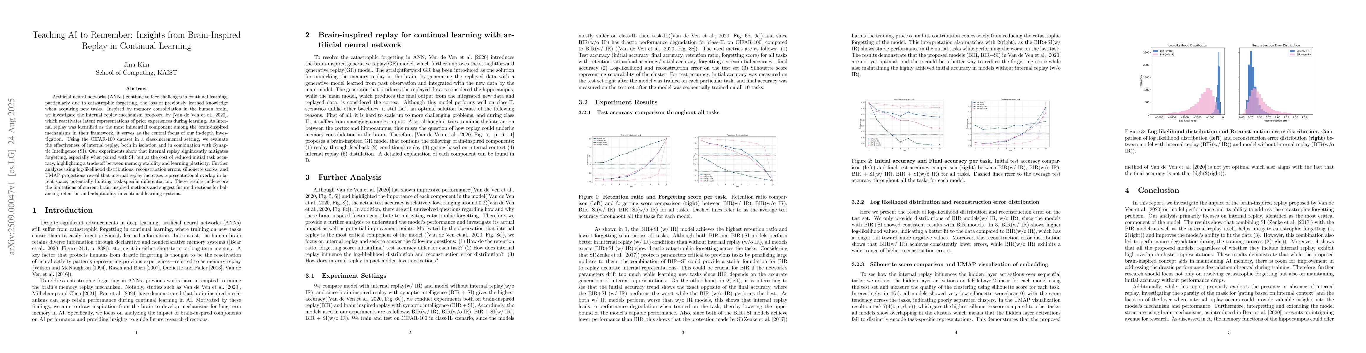 Artificial neural networks (ANNs) continue to face challenges in continual learning, particularly due to catastrophic forgetting, the loss of previously learned knowledge when acquiring new tasks. Inspired by memory consolidation in the human brain, we investigate the internal replay mechanism proposed by~\citep{brain_inspired_replay1}, which reactivates latent representations of prior experiences during learning. As internal replay was identified as the most influential component among the brain-inspired mechanisms in their framework, it serves as the central focus of our in-depth investigation. Using the CIFAR-100 dataset in a class-incremental setting, we evaluate the effectiveness of internal replay, both in isolation and in combination with Synaptic Intelligence (SI). Our experiments show that internal replay significantly mitigates forgetting, especially when paired with SI, but at the cost of reduced initial task accuracy, highlighting a trade-off between memory stability and learning plasticity. Further analyses using log-likelihood distributions, reconstruction errors, silhouette scores, and UMAP projections reveal that internal replay increases representational overlap in latent space, potentially limiting task-specific differentiation. These results underscore the limitations of current brain-inspired methods and suggest future directions for balancing retention and adaptability in continual learning systems.