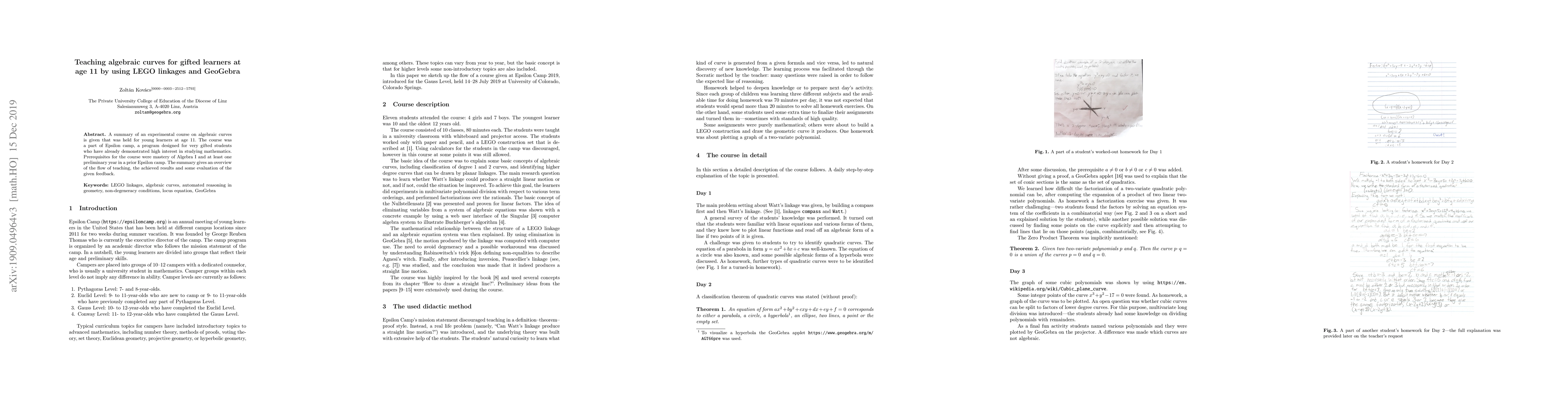 This study details an experimental course on algebraic curves for gifted 11-year-olds using LEGO linkages and GeoGebra, showing positive outcomes and favorable feedback from participants who had prior Algebra I knowledge and experience.
