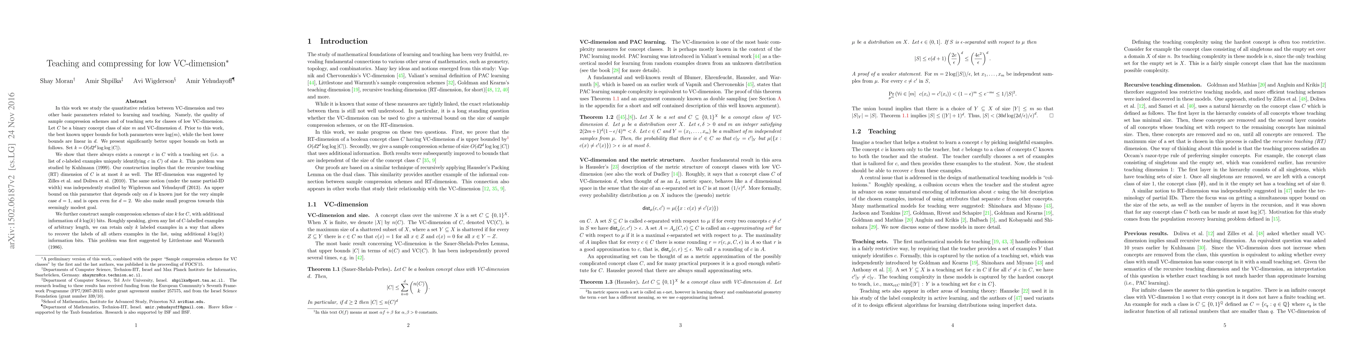 In this work we study the quantitative relation between VC-dimension and two other basic parameters related to learning and teaching. Namely, the quality of sample compression schemes and of teaching sets for classes of low VC-dimension. Let $C$ be a binary concept class of size $m$ and VC-dimension $d$. Prior to this work, the best known upper bounds for both parameters were $\log(m)$, while the best lower bounds are linear in $d$. We present significantly better upper bounds on both as follows. Set $k = O(d 2^d \log \log |C|)$. We show that there always exists a concept $c$ in $C$ with a teaching set (i.e. a list of $c$-labeled examples uniquely identifying $c$ in $C$) of size $k$. This problem was studied by Kuhlmann (1999). Our construction implies that the recursive teaching (RT) dimension of $C$ is at most $k$ as well. The RT-dimension was suggested by Zilles et al. and Doliwa et al. (2010). The same notion (under the name partial-ID width) was independently studied by Wigderson and Yehudayoff (2013). An upper bound on this parameter that depends only on $d$ is known just for the very simple case $d=1$, and is open even for $d=2$. We also make small progress towards this seemingly modest goal. We further construct sample compression schemes of size $k$ for $C$, with additional information of $k \log(k)$ bits. Roughly speaking, given any list of $C$-labelled examples of arbitrary length, we can retain only $k$ labeled examples in a way that allows to recover the labels of all others examples in the list, using additional $k\log (k)$ information bits. This problem was first suggested by Littlestone and Warmuth (1986).