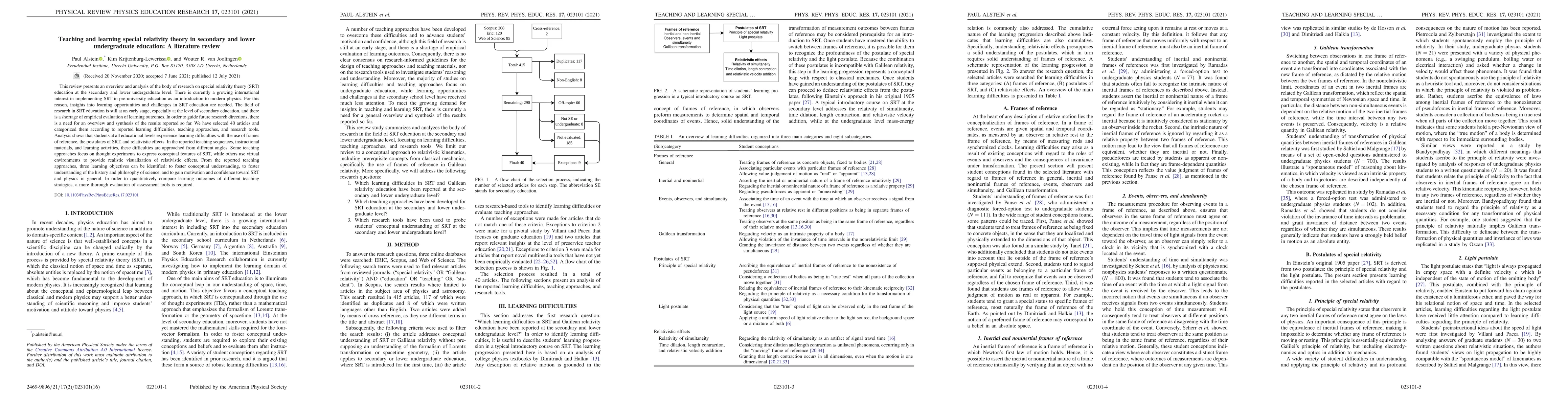 This literature review analyzes research on teaching and learning special relativity in secondary and lower undergraduate education, highlighting common student difficulties, diverse teaching approaches, and the need for better assessment tools to evaluate learning outcomes. The review categorizes findings from 40 articles, emphasizing the importance of conceptual understanding, historical context, and motivational goals in SRT education.