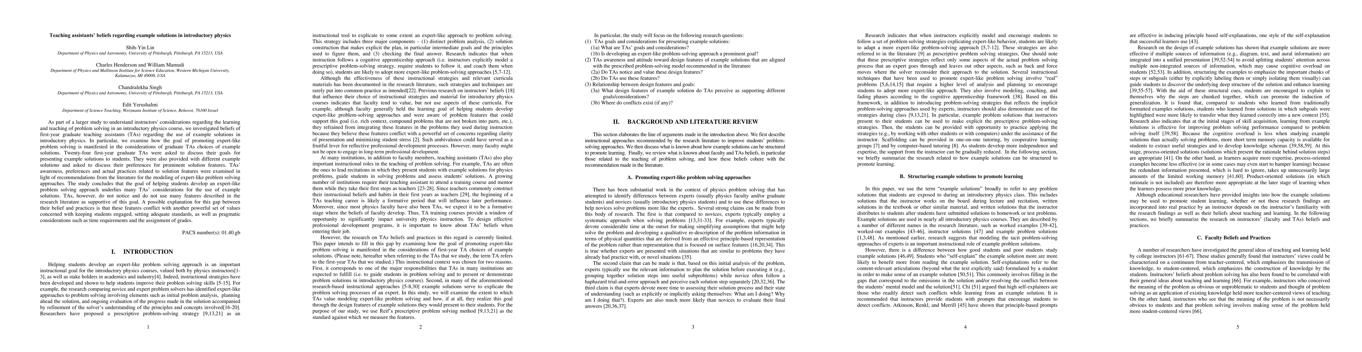 This study explores first-year graduate teaching assistants' beliefs about using example solutions in introductory physics to promote expert-like problem solving. Despite TAs' awareness of this goal, they often overlook recommended solution features due to conflicting values and practical constraints.