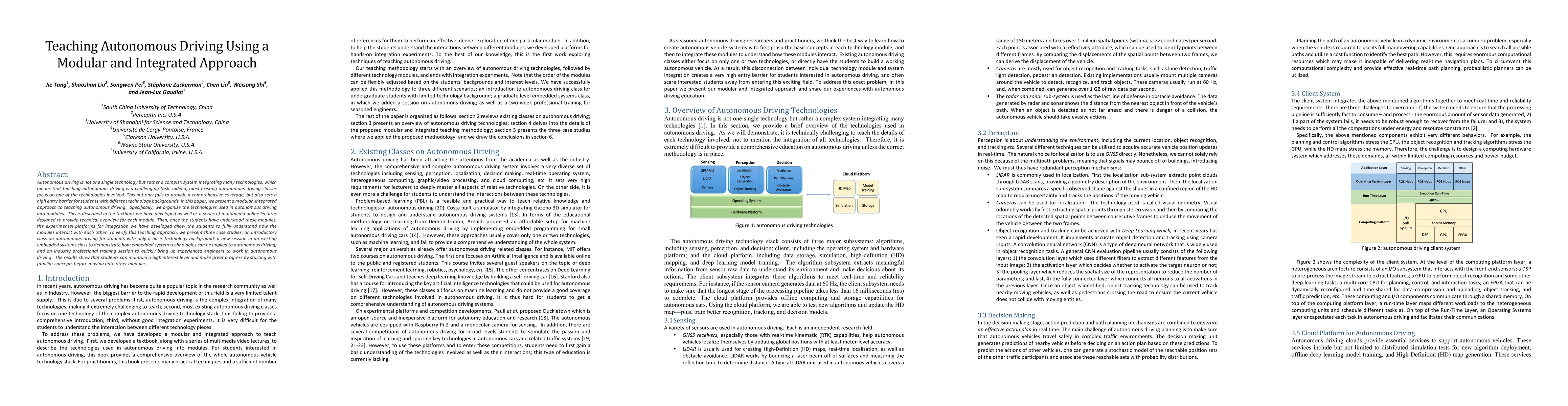 This paper proposes a modular, integrated teaching approach for autonomous driving that organizes various technologies into modules, aiming to provide comprehensive coverage and lower entry barriers for students. The approach includes textbooks, online lectures, and experimental platforms, and has been successfully tested in different educational settings.
