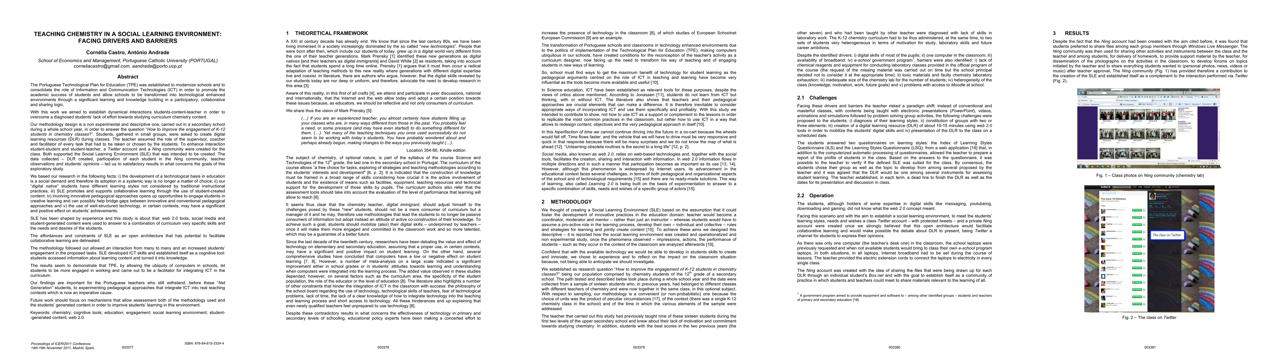 The Portuguese Technological Plan for Education (TPE) was established to modernize schools and to consolidate the role of Information and Communication Technologies (ICT) in order to promote the academic success of students and allow schools to be transformed into technological enriched environments through a significant learning and knowledge building in a participatory, collaborative and sharing logic. With this work we aimed to establish dynamical interactions students-content- teacher in order to overcome a diagnosed students' lack of effort towards studying curriculum chemistry content. Our methodology design is a theoretical and descriptive one, carried out in a secondary school during the 2009/2010 school year, in order to answer the question "How to improve the engagement of K-12 students in chemistry classes?". Students, gathered in small groups were asked to create digital learning resources (DLR) during classes. The teacher assumed the role of the supervisor, coacher and facilitator of every task that had to be taken or chosen by the students. To enhance interaction student-student and student-teacher, a Twitter account and a Ning site were created for the class. Both supported the Social Learning Environment (SLE) that was intended to be created. The data collected led us to satisfactory results in what concerns the goals of the study. The affordances and constraints of SLE as an open architecture that has potential to facilitate collaborative learning are delineated. Future work should focus on mechanisms that allow assessment both of the methodology used and the students' generated content in order to improve students' learning in this environment.