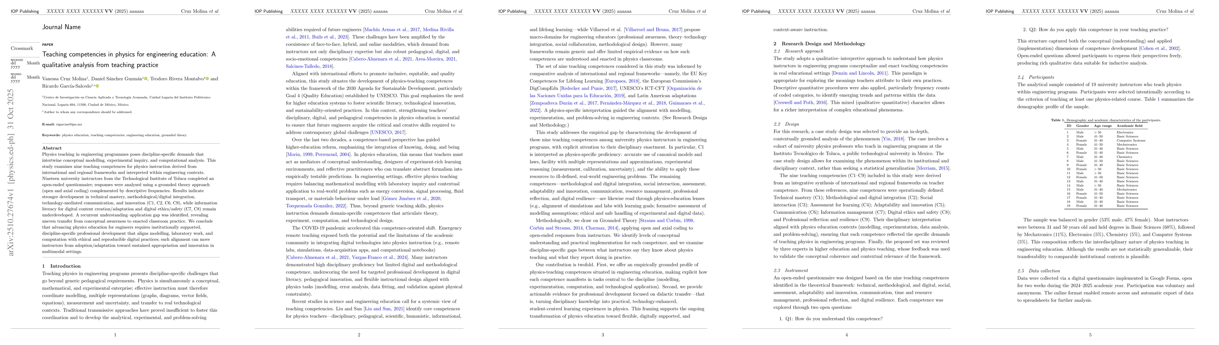 The study employed a mixed-methods approach combining grounded theory and descriptive frequency analysis to examine teaching competencies among university physics instructors in engineering programs. Researchers analyzed both conceptual and applied dimensions of professional performance in physics education.