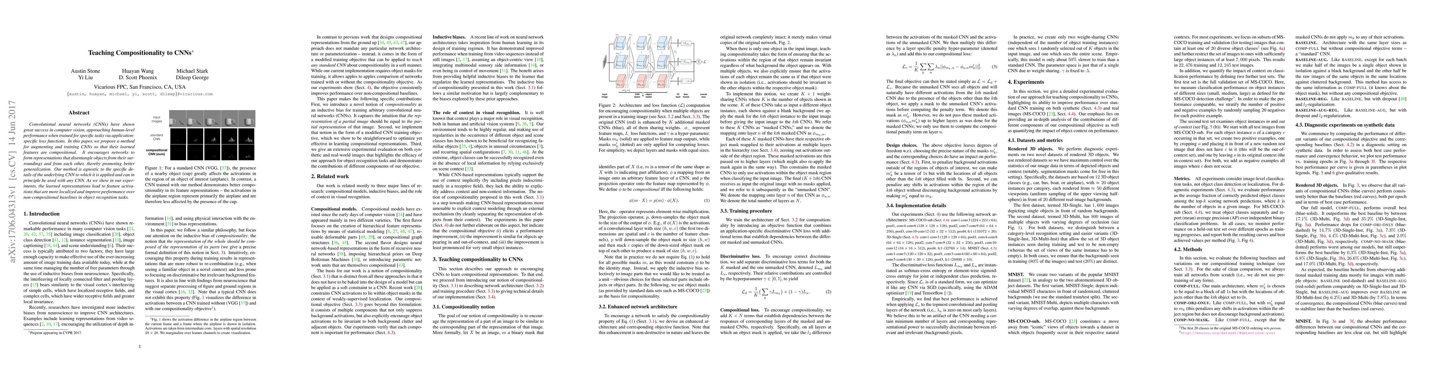 Convolutional neural networks (CNNs) have shown great success in computer vision, approaching human-level performance when trained for specific tasks via application-specific loss functions. In this paper, we propose a method for augmenting and training CNNs so that their learned features are compositional. It encourages networks to form representations that disentangle objects from their surroundings and from each other, thereby promoting better generalization. Our method is agnostic to the specific details of the underlying CNN to which it is applied and can in principle be used with any CNN. As we show in our experiments, the learned representations lead to feature activations that are more localized and improve performance over non-compositional baselines in object recognition tasks.