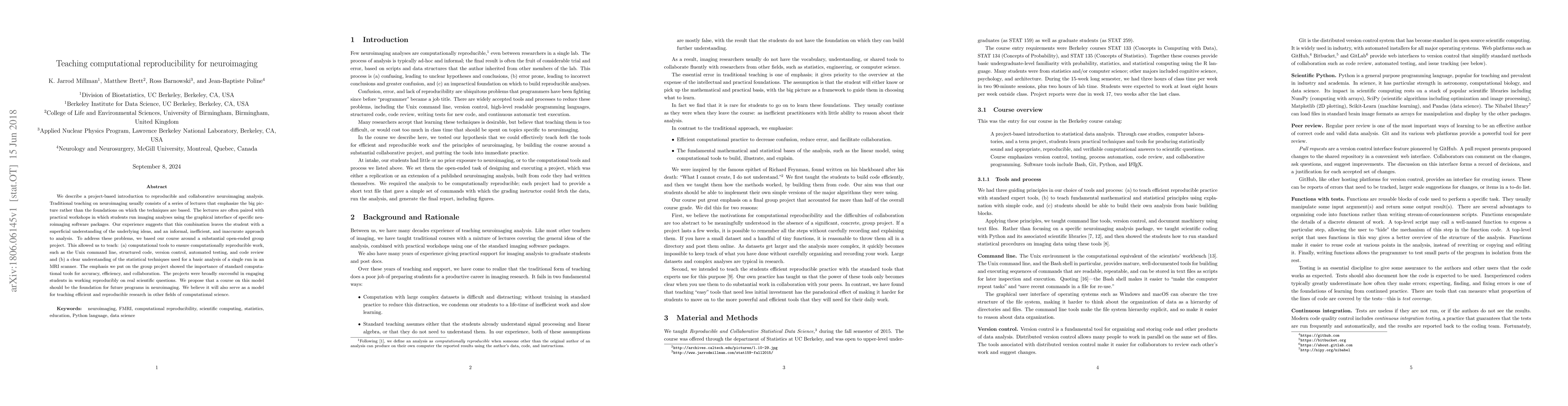 This research introduces a project-based course for teaching reproducible neuroimaging analysis, emphasizing computational tools and collaborative projects over traditional lectures. The course successfully engages students in accurate, efficient, and collaborative research practices, suggesting it as a foundational model for future neuroimaging and computational science programs.