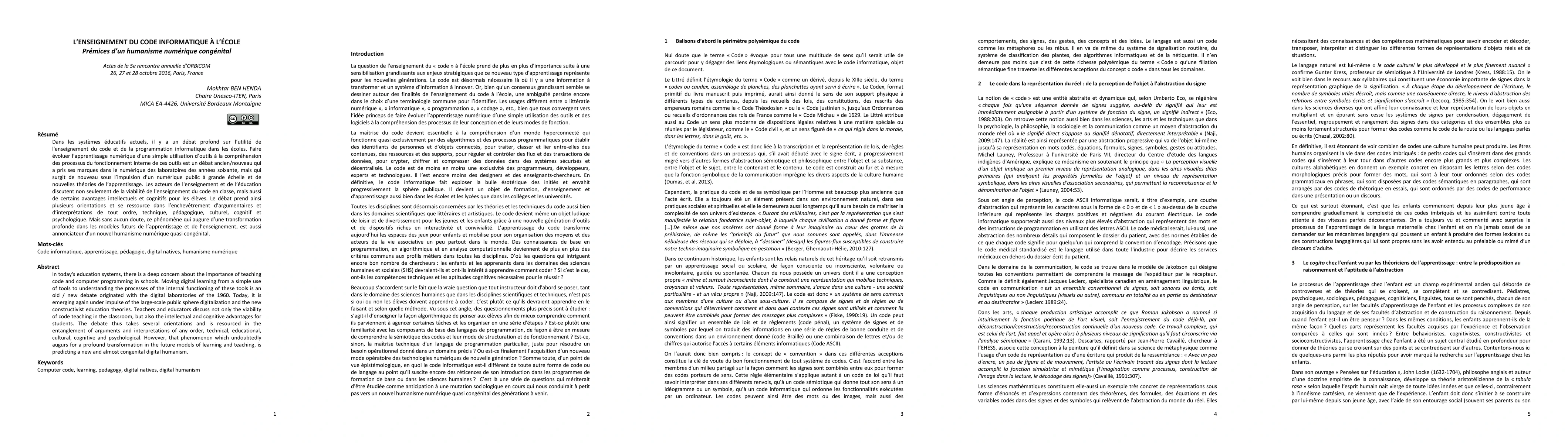 In today's education systems, there is a deep concern about the importance of teaching code and computer programming in schools. Moving digital learning from a simple use of tools to understanding the processes of the internal functioning of these tools is an old / new debate originated with the digital laboratories of the 1960. Today, it is emerging again under impulse of the large - scale public sphere digitalization and the new constructivist education theories. Teachers and educators discuss not only the viability of code teaching in the classroom, but also the intellectual and cognitive advantages for students. The debate thus takes several orientations and is resourced in the entanglement of arguments and interpretations of any order, technical, educational, cultural, cognitive and psychological. However, that phenomenon which undoubtedly augurs for a profound transformation in the future models of learning and teaching , is predicting a new and almost congenital digital humanism