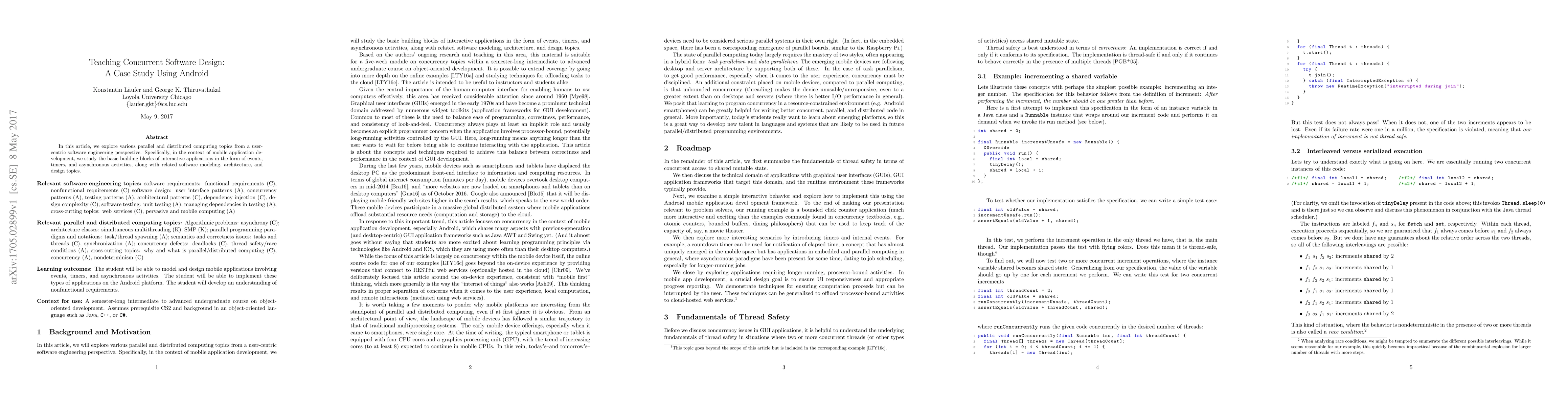 Summary: This paper investigates the teaching of concurrent software design through Android mobile application development, focusing on events, timers, and asynchronous activities, and explores related software modeling and architecture. The study aims to enhance user-centric software engineering education in parallel and distributed computing.