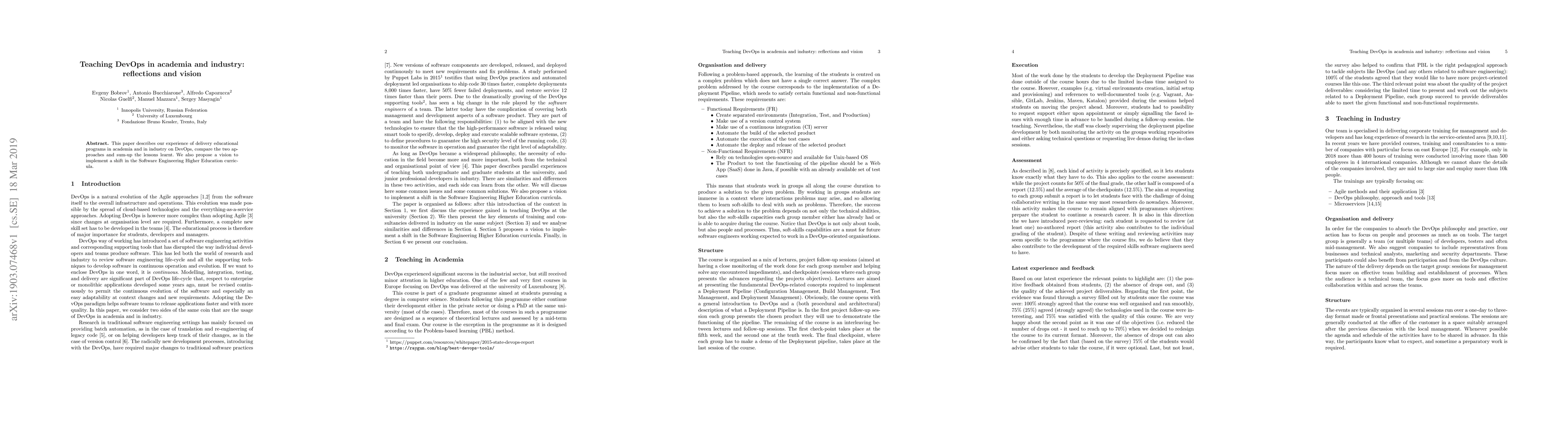 This paper compares teaching DevOps in academia and industry, highlighting key lessons learned for a proposed shift in software engineering education curricula.