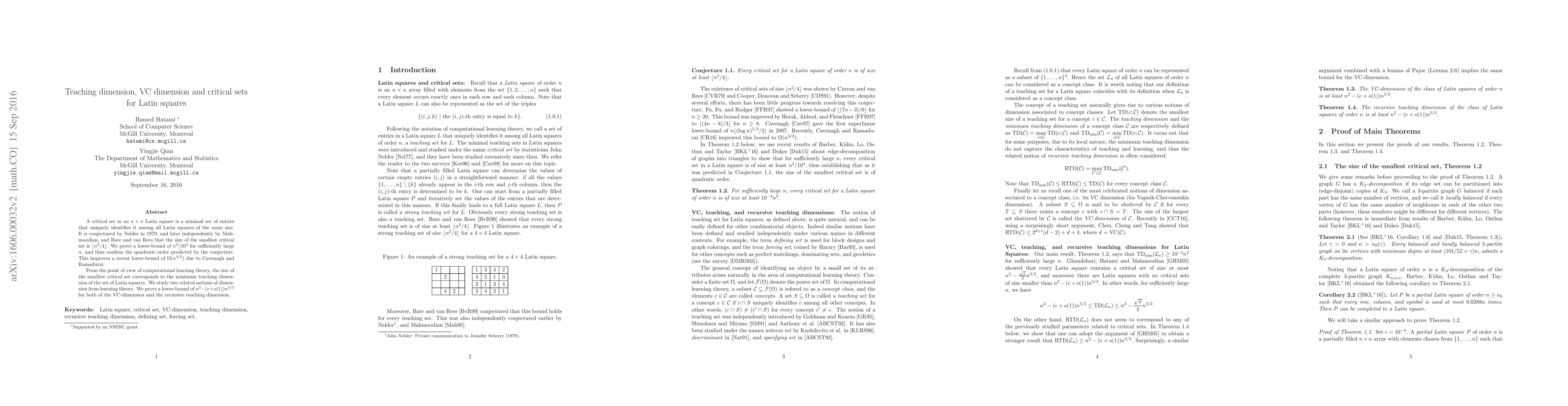 A critical set in an $n \times n$ Latin square is a minimal set of entries that uniquely identifies it among all Latin squares of the same size. It is conjectured by Nelder in 1979, and later independently by Mahmoodian, and Bate and van Rees that the size of the smallest critical set is $\lfloor n^2/4\rfloor$. We prove a lower-bound of $n^2/10^4$ for sufficiently large $n$, and thus confirm the quadratic order predicted by the conjecture. We prove a lower-bound of $n^2/10^4$ for sufficiently large $n$, and thus confirm the quadratic order predicted by the conjecture. This improves a recent lower-bound of $\Omega(n^{3/2})$ due to Cavenagh and Ramadurai. From the point of view of computational learning theory, the size of the smallest critical set corresponds to the minimum teaching dimension of the set of Latin squares. We study two related notions of dimension from learning theory. We prove a lower-bound of $n^2-(e+o(1))n^{5/3}$ for both of the VC-dimension and the recursive teaching dimension.