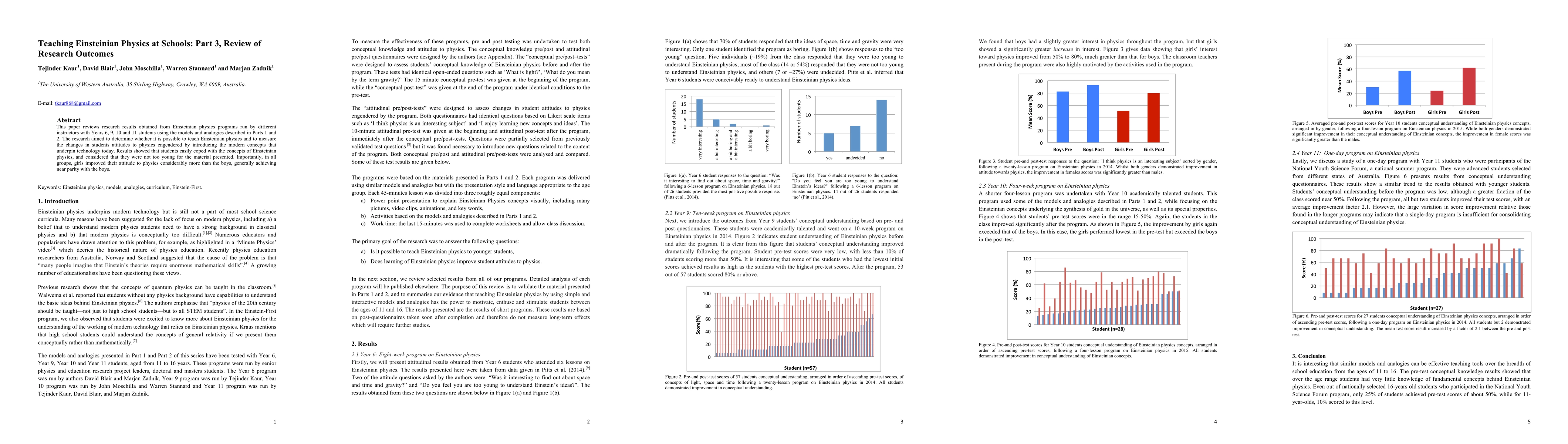 This paper reviews research on teaching Einsteinian physics to different school year groups, showing students' successful comprehension and improved attitudes, especially girls, who significantly closed the gender gap in physics attitudes.