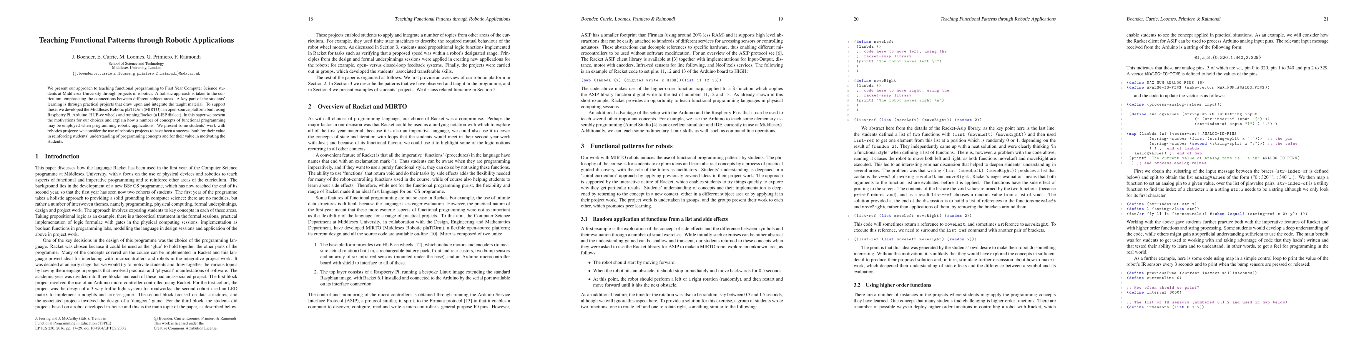 We present our approach to teaching functional programming to First Year Computer Science students at Middlesex University through projects in robotics. A holistic approach is taken to the curriculum, emphasising the connections between different subject areas. A key part of the students' learning is through practical projects that draw upon and integrate the taught material. To support these, we developed the Middlesex Robotic plaTfOrm (MIRTO), an open-source platform built using Raspberry Pi, Arduino, HUB-ee wheels and running Racket (a LISP dialect). In this paper we present the motivations for our choices and explain how a number of concepts of functional programming may be employed when programming robotic applications. We present some students' work with robotics projects: we consider the use of robotics projects to have been a success, both for their value in reinforcing students' understanding of programming concepts and for their value in motivating the students.