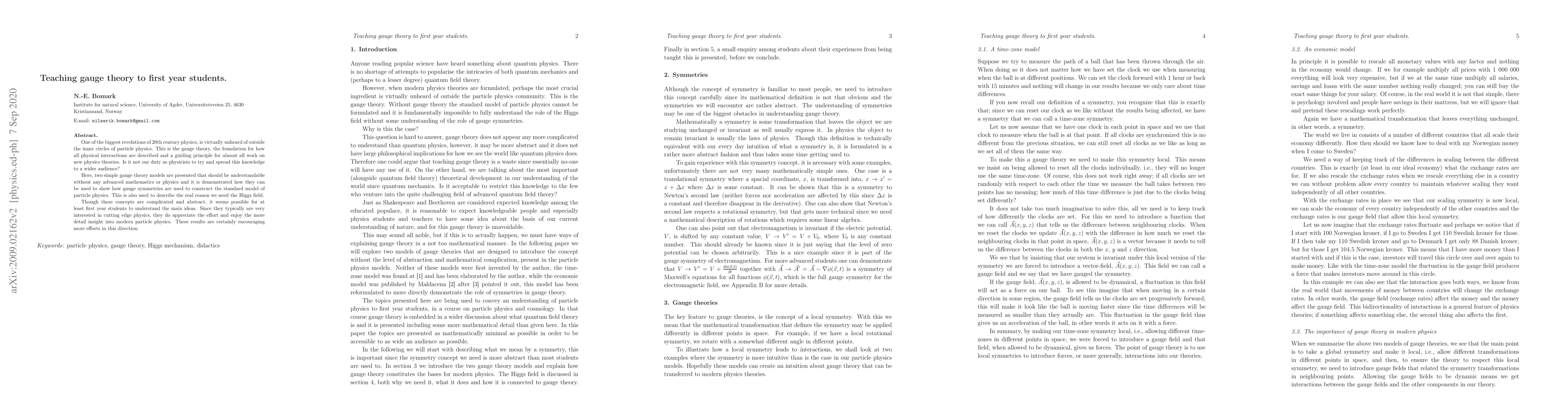 One of the biggest revelations of 20th century physics, is virtually unheard of outside the inner circles of particle physics. This is the gauge theory, the foundation for how all physical interactions are described and a guiding principle for almost all work on new physics theories. Is it not our duty as physicists to try and spread this knowledge to a wider audience? Here, two simple gauge theory models are presented that should be understandable without any advanced mathematics or physics and it is demonstrated how they can be used to show how gauge symmetries are used to construct the standard model of particle physics. This is also used to describe the real reason we need the Higgs field. Though these concepts are complicated and abstract, it seems possible for at least first year students to understand the main ideas. Since they typically are very interested in cutting edge physics, they do appreciate the effort and enjoy the more detail insight into modern particle physics. These results are certainly encouraging more efforts in this direction.