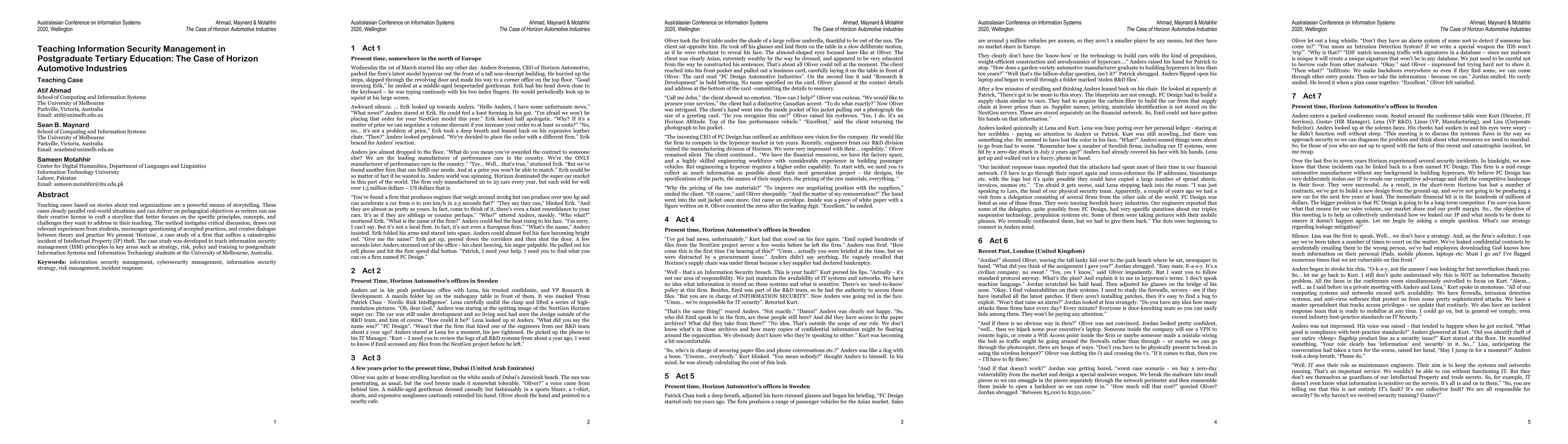 This paper explores the use of real-world teaching cases based on stories of organizations to teach information security management, using Horizon Automotive Industries as a case study of an IP theft incident. The method aims to foster critical discussions and bridge theory and practice for postgraduate students.