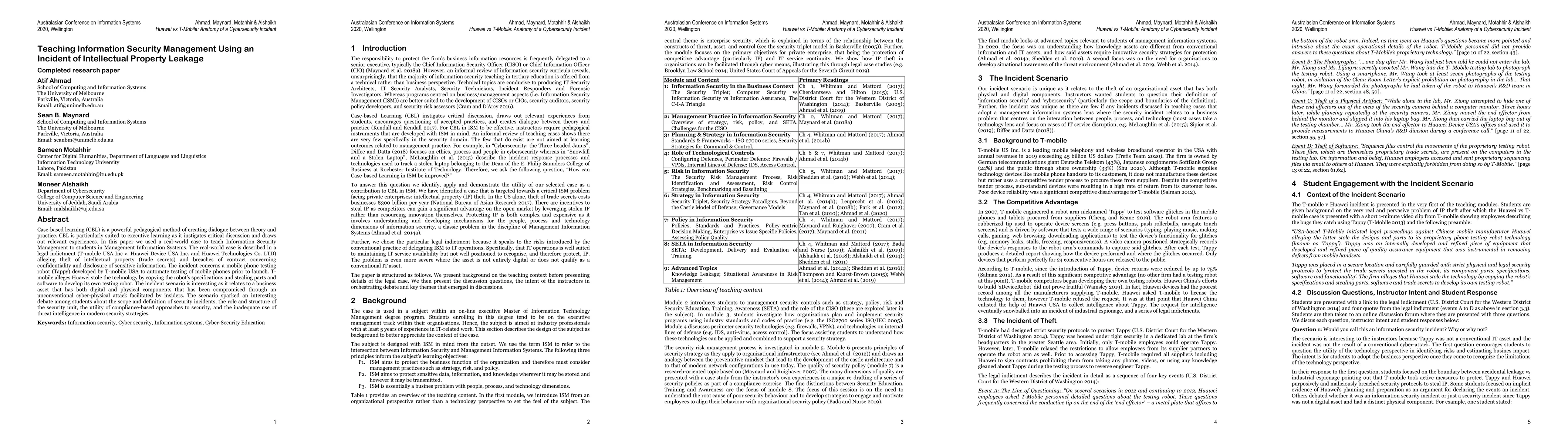 This paper employs a real-world case involving intellectual property theft and breaches of confidentiality in a T-mobile vs. Huawei legal indictment to teach Information Security Management using case-based learning. The case sparked discussions on security incidents, security unit roles, compliance approaches, and threat intelligence.