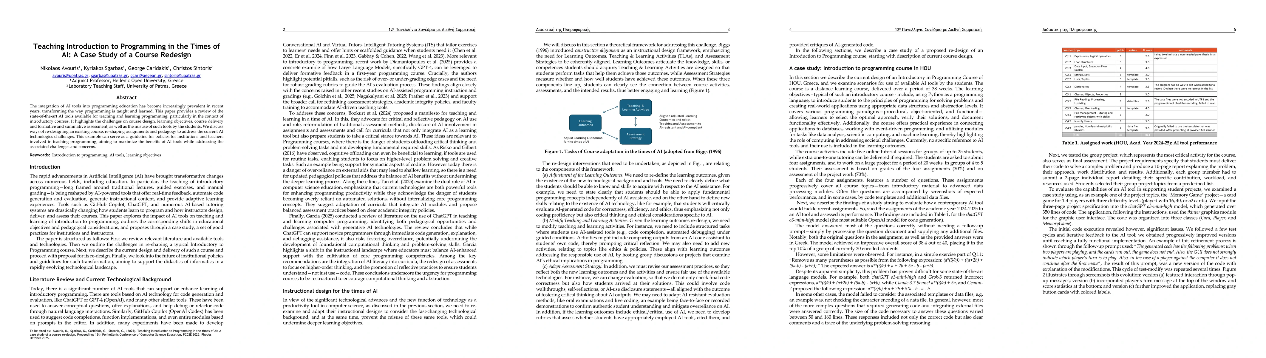The integration of AI tools into programming education has become increasingly prevalent in recent years, transforming the way programming is taught and learned. This paper provides a review of the state-of-the-art AI tools available for teaching and learning programming, particularly in the context of introductory courses. It highlights the challenges on course design, learning objectives, course delivery and formative and summative assessment, as well as the misuse of such tools by the students. We discuss ways of re-designing an existing course, re-shaping assignments and pedagogy to address the current AI technologies challenges. This example can serve as a guideline for policies for institutions and teachers involved in teaching programming, aiming to maximize the benefits of AI tools while addressing the associated challenges and concerns.