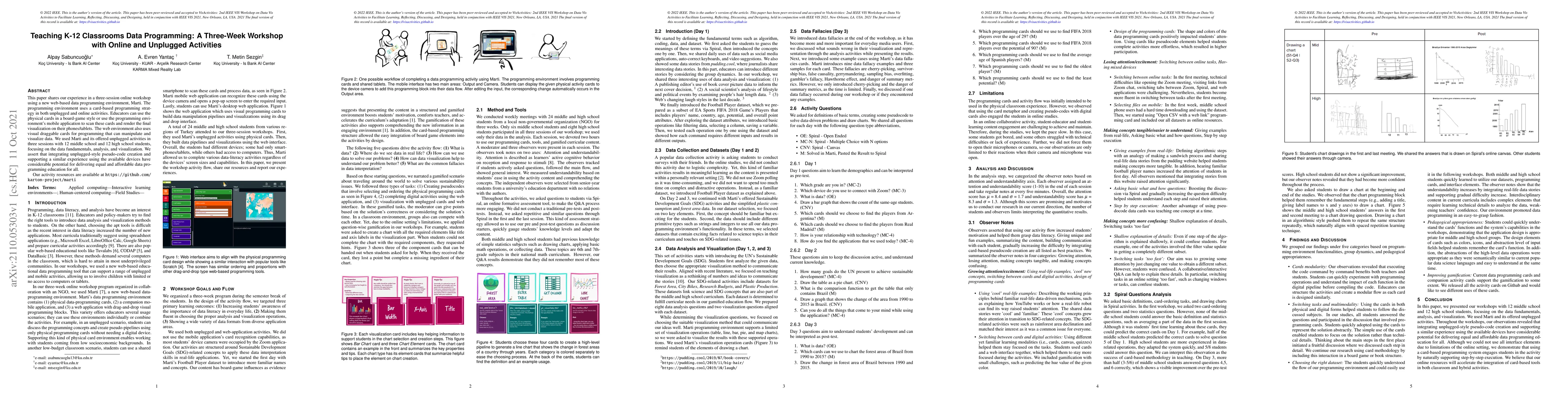 This paper shares our experience in a three-session online workshop using a new web-based data programming environment, Marti. The programming environment uses a card-based programming strategy in both unplugged and online activities. Educators can use the physical cards in a board-game style or use the programming environment's mobile application to scan these cards and render the final visualization on their phones/tablets. The web environment also uses visual draggable cards for programming that can manipulate and visualize data. We used Marti and its offered unplugged activities in three sessions with 12 middle school and 12 high school students, focusing on the data fundamentals, analysis, and visualization. We assert that integrating unplugged-style pseudo-code creation and supporting a similar experience using the available devices have considerable potential for delivering equal and affordable data programming education for all.
